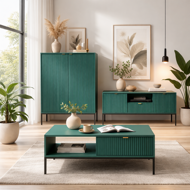 Toaletka NANAIMO – Zielona – Złote Uchwyty – Dwie Szuflady – Szerokość 104 cm, Wysokość 77 cm, Głębokość 50 cm