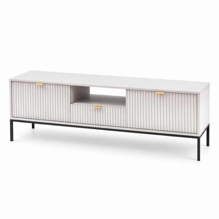Szafka pod telewizor NANAIMO – Szary – Złote Uchwyt – Szerokość 154 cm, Wysokość 56 cm, Głębokość 39 cm