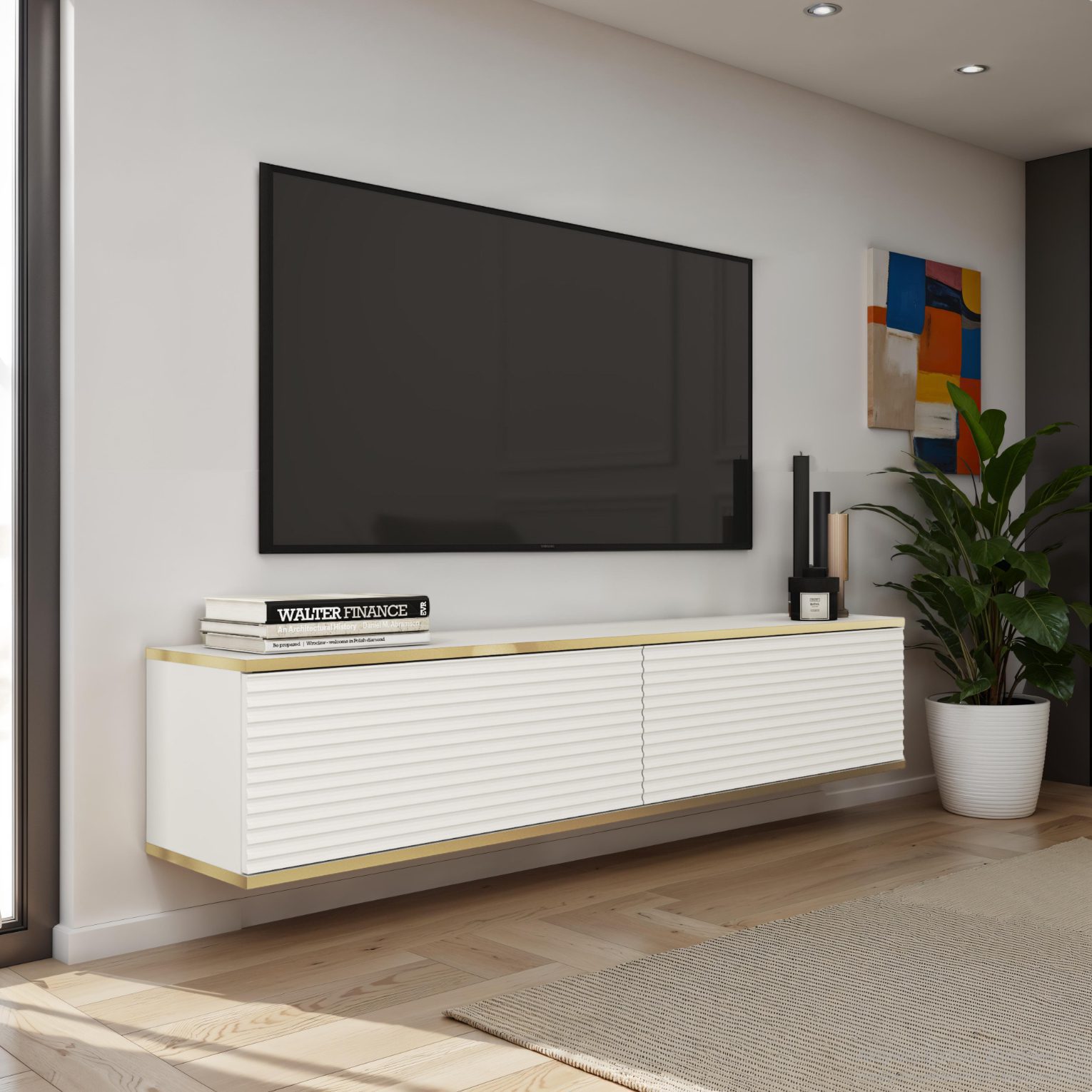 Szafka RTV Banff 135 MDF w wersji matowej bieli to elegancki mebel o lekkiej, nowoczesnej formie, który doskonale dopełni jasne, minimalistyczne wnętrza. Gładki front bez uchwytów, otwierany na klik (push-to-open), tworzy czystą i spójną wizualnie bryłę. Połączenie bieli z ciepłym dekorem dębu artisan dodaje meblowi przytulności i ponadczasowego uroku. Szafka wyposażona jest w trzy praktyczne schowki, ukryte za pełnymi frontami, a stabilne, wysokie, czarne metalowe nogi nadają jej wizualnej lekkości i ułatwiają utrzymanie porządku pod meblem. To doskonałe rozwiązanie zarówno pod telewizor, jak i jako schowek na dokumenty, sprzęt lub akcesoria multimedialne.