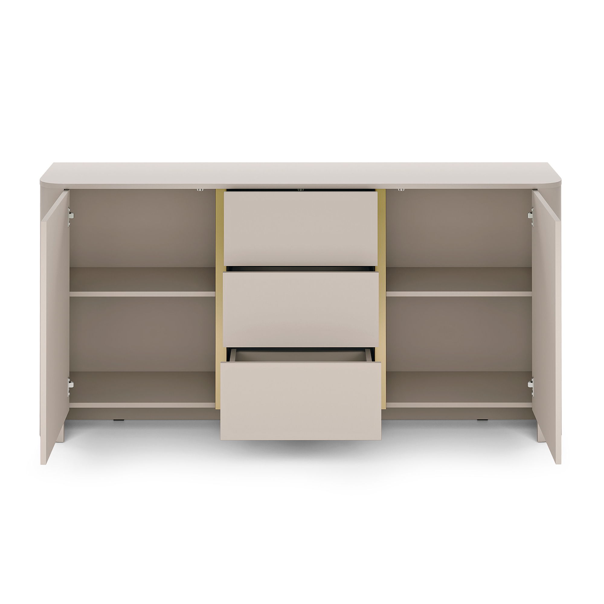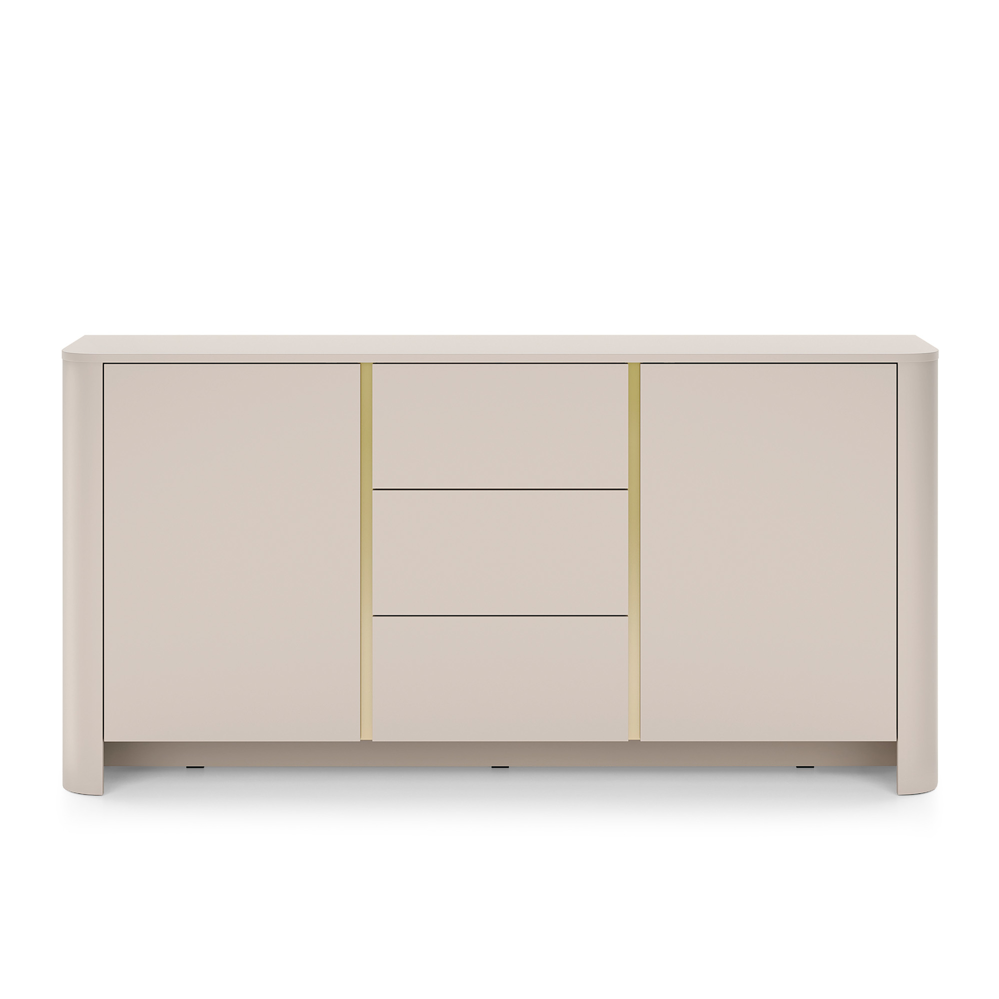Korpus i fronty wykonano z płyty laminowanej o grubości 16 mm, a wszystkie krawędzie zabezpieczono obrzeżem ABS, co zwiększa odporność na codzienne użytkowanie i zapewnia eleganckie wykończenie. Charakterystycznym elementem komody są zaokrąglone boki z wytrzymałej płyty MDF 18 mm, które dodają bryle lekkości, łagodności i wyjątkowego charakteru.