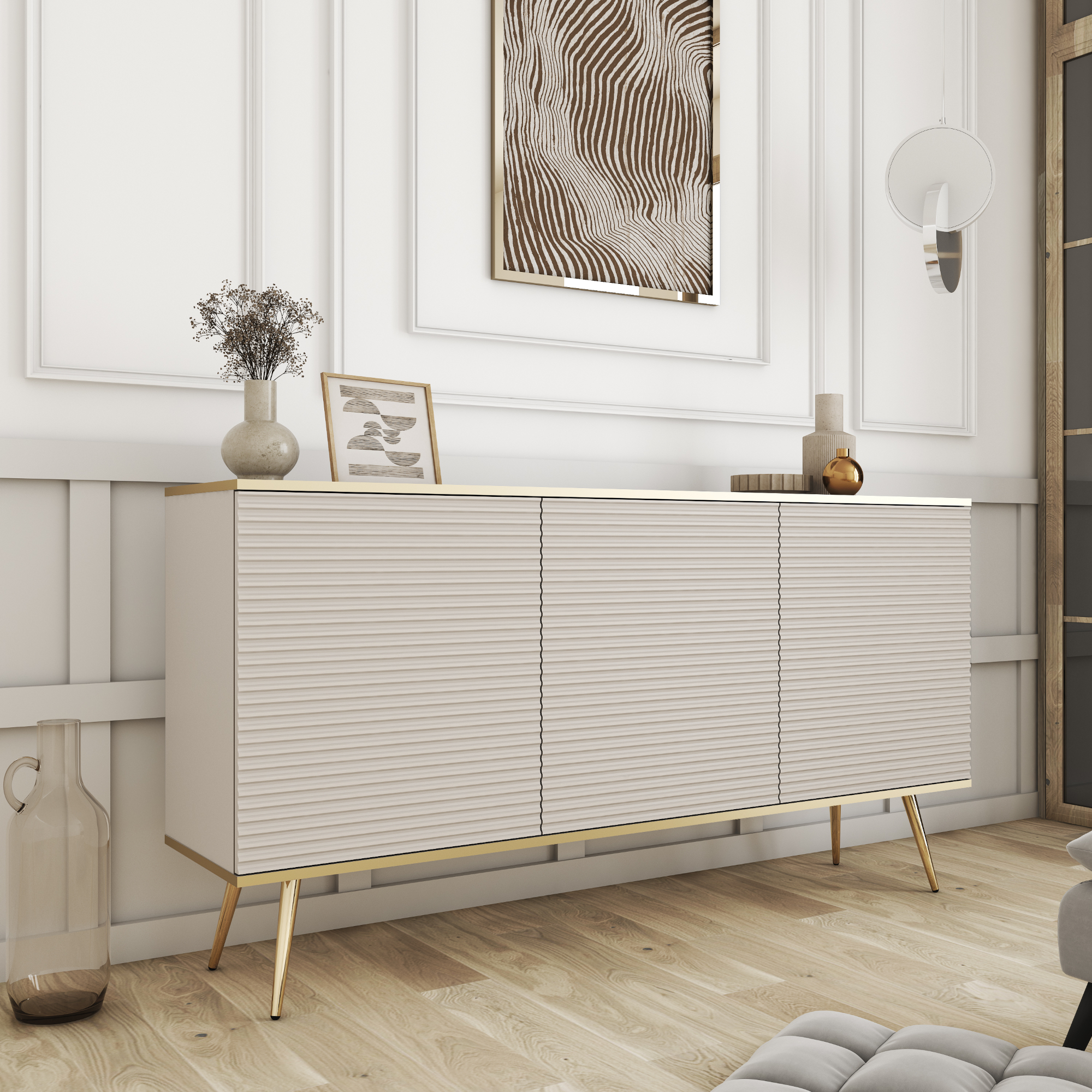 Komoda Banff K160 MDF – beżowa – złote nogi – ryflowane fronty – szerokość 160 cm, wysokość 85 cm, głębokość 39 cm