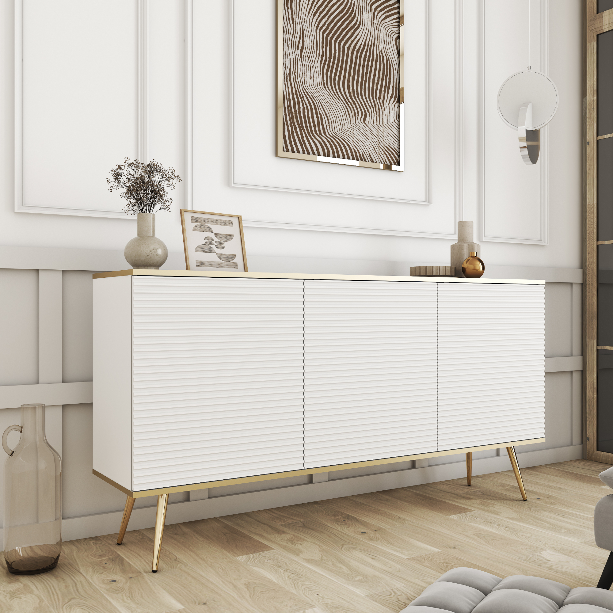 Kommode Banff K160 MDF – Biała – Złote Nogi – Ryflowane Fronty – Szerokość 160 cm, Wysokość 85 cm, Głębokość 39 cm