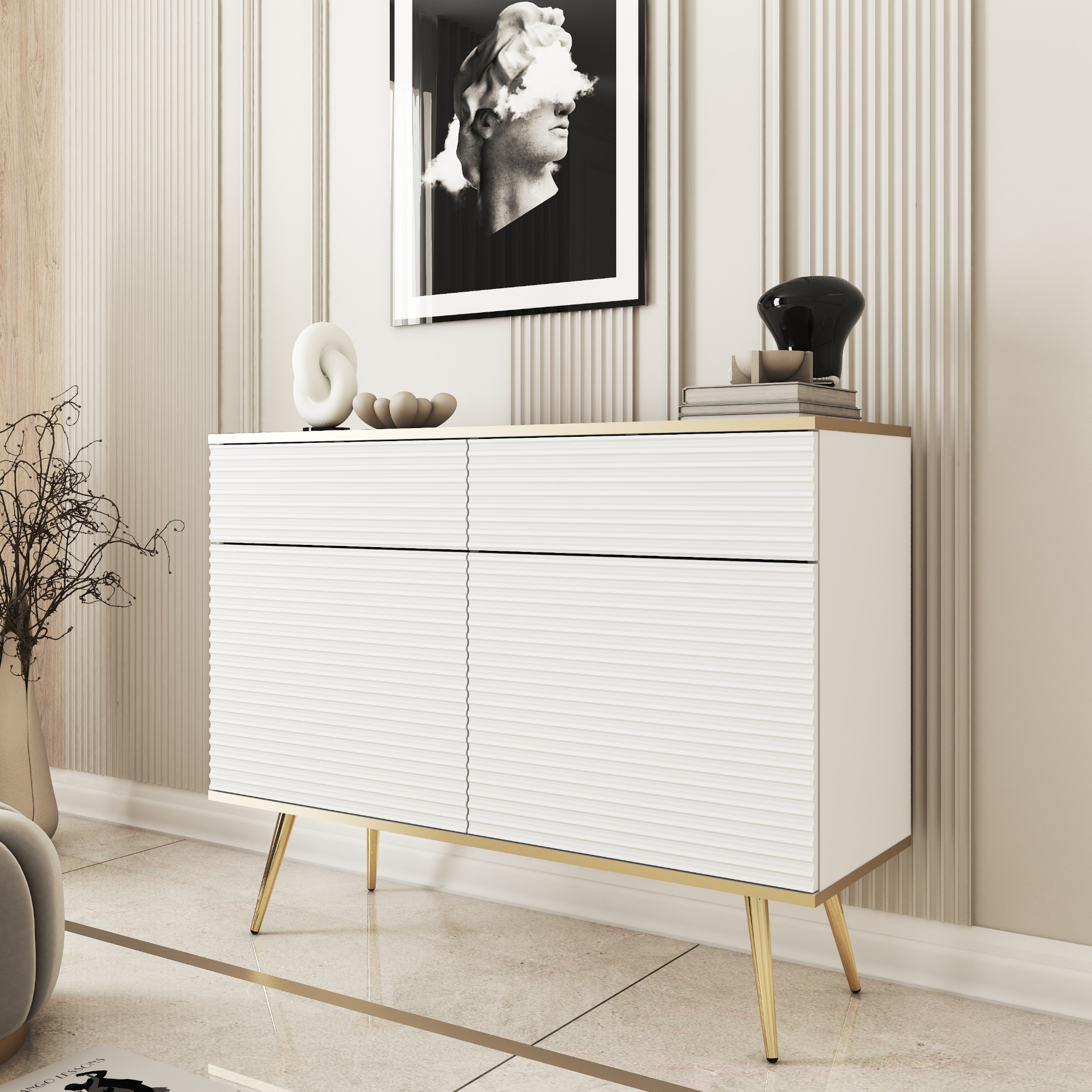 Kommode Banff KSZ107 MDF – Biały – Złote Nogi – Rylcowane Fronty – 2 Szuflady – Szerokość 107 cm, Wysokość 85 cm, Głębokość 39 cm