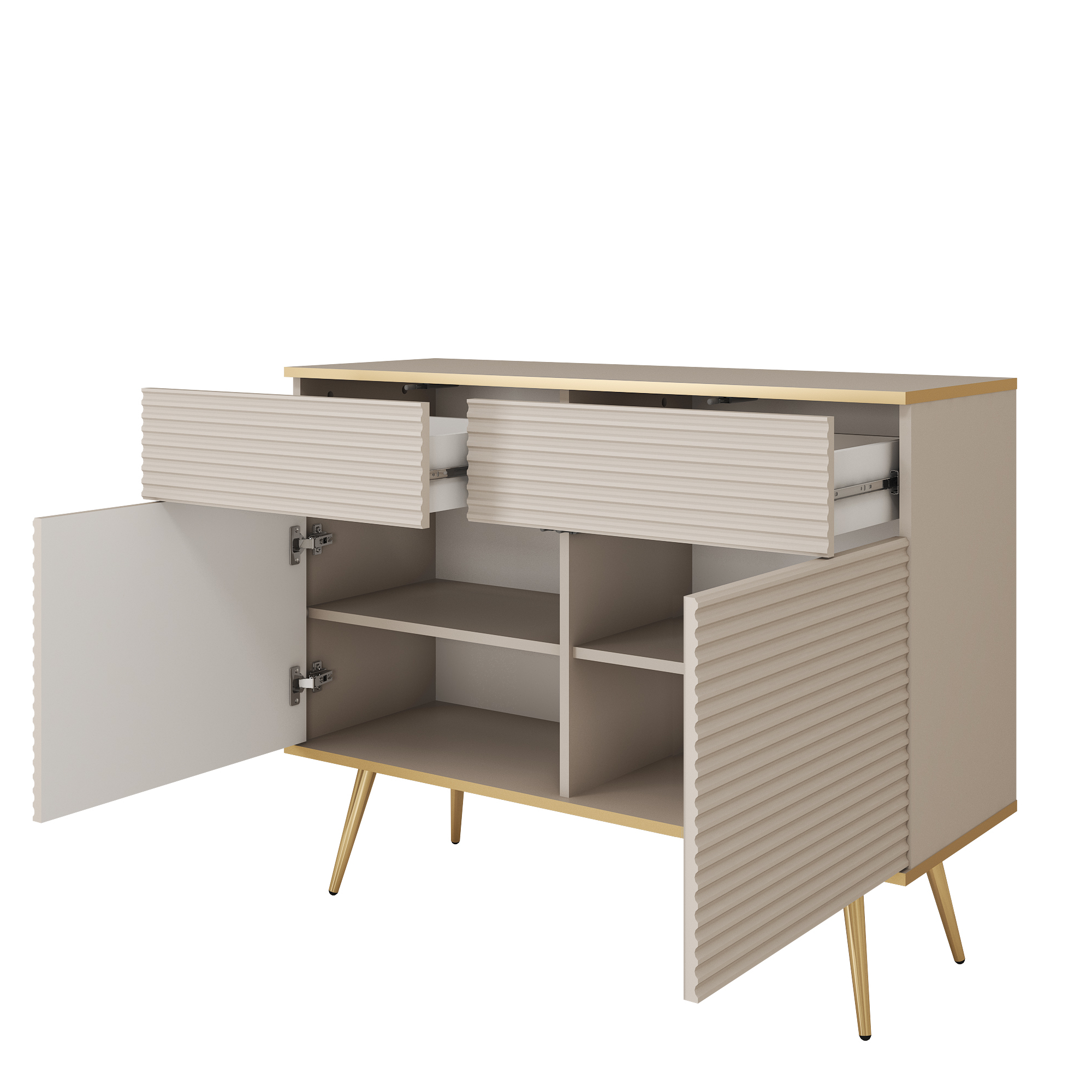 Mebel dostępny jest w trzech efektownych wariantach kolorystycznych ze złotymi akcentami – beżowym, białym i czarnym. Każdy z nich został podkreślony eleganckimi wstawkami, które nadają komodzie prestiżowego charakteru i sprawiają, że wygląda luksusowo. Konstrukcja spoczywa na metalowych nogach w kolorze złotym, wykończonych w wysokim połysku, co nie tylko dodaje jej lekkości, ale również ułatwia utrzymanie porządku pod meblem.