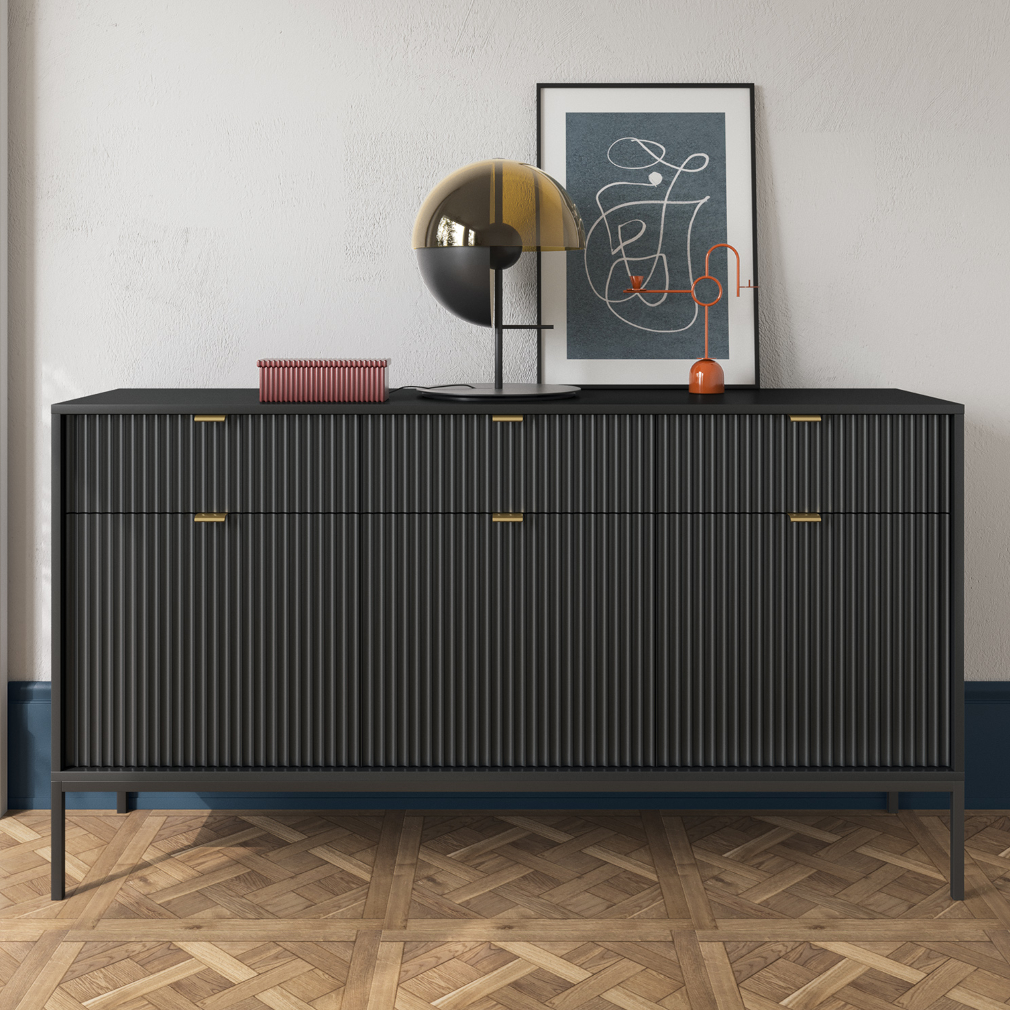 Mebel wyróżnia się ryflowanymi frontami, geometrycznym stalowym stelażem oraz eleganckimi uchwytami ze szczotkowanego aluminium, które przyciągają spojrzenia i nadają całości unikalnego charakteru. Komoda dostępna jest w 5 modnych kolorach: kaszmirowym, białym, zielonym, czarnym i szarym, co pozwala łatwo dopasować ją do aranżacji wnętrza.