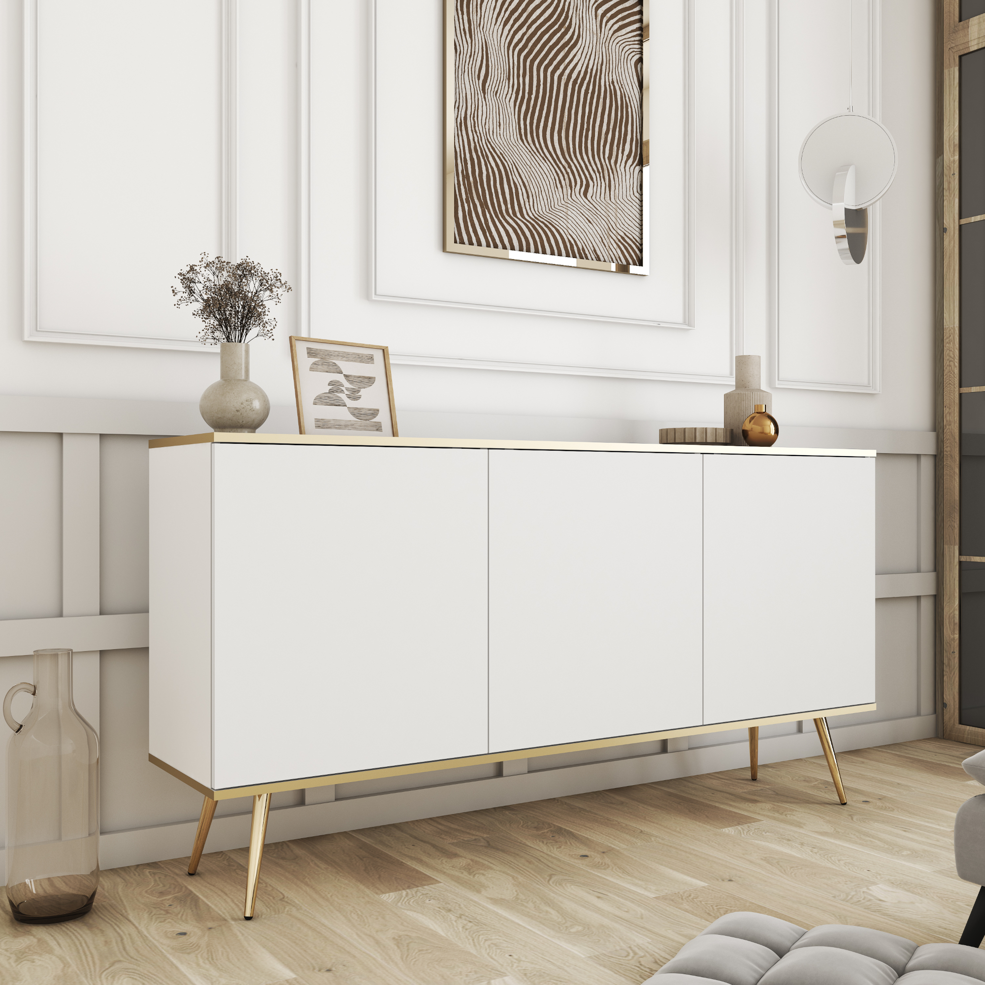 Komoda Banff K160 – Biała – Złote Nogi – Szerokość 160 cm, Wysokość 85 cm, Głębokość 39 cm