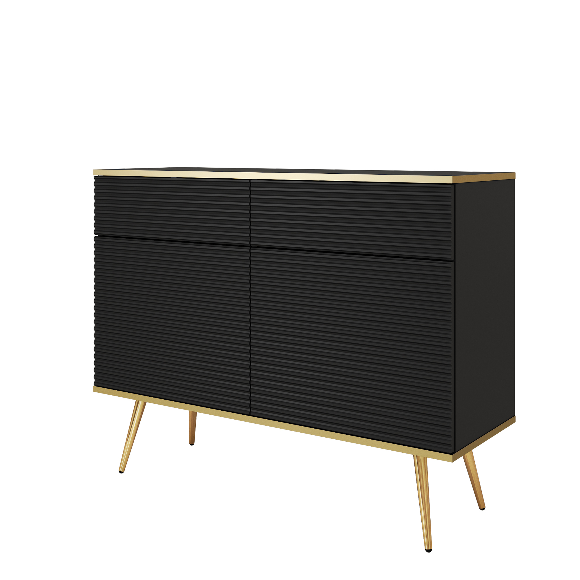 Komoda Banff KSZ107 MDF – Czarna – Złote Nogi – Ryflowane Fronty – 2 Szuflady – Szerokość 107 cm, Wysokość 85 cm, Głębokość 39 cm
