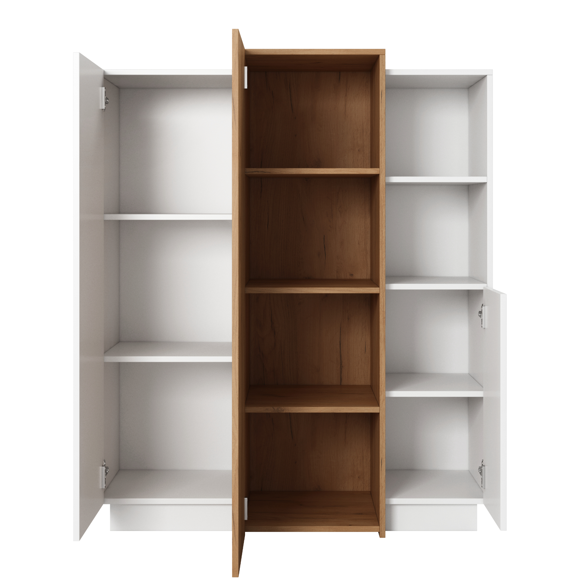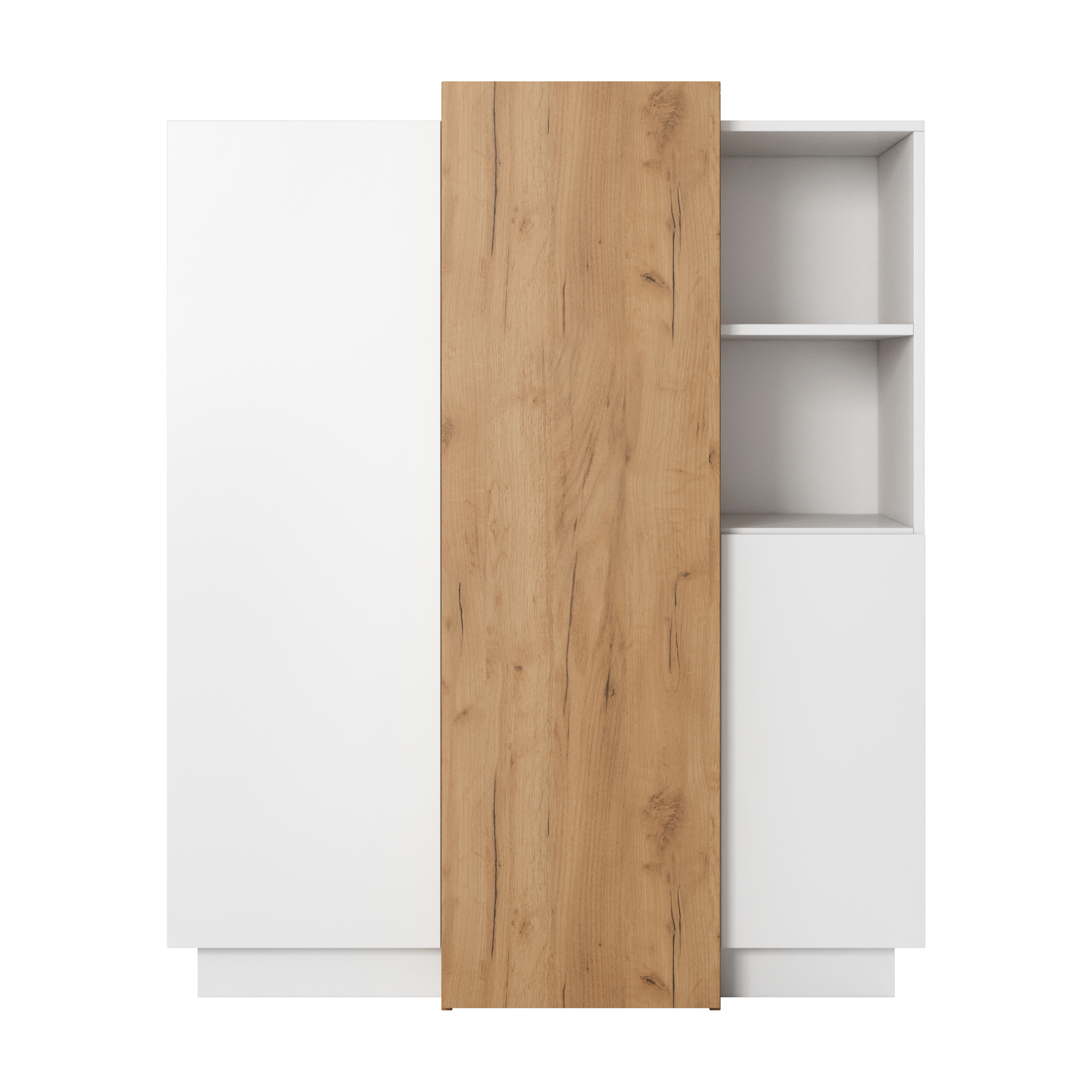 Kolekcja mebli została zaprojektowana z myślą o nowoczesnych wnętrzach, w których liczy się zarówno estetyka, jak i codzienna funkcjonalność. Harmonijne połączenie bieli z naturalnymi, drewnianymi akcentami w odcieniu złotego dębu nadaje bryłom ciepły, elegancki charakter i sprawia, że wnętrze staje się bardziej przytulne, a jednocześnie nowoczesne.