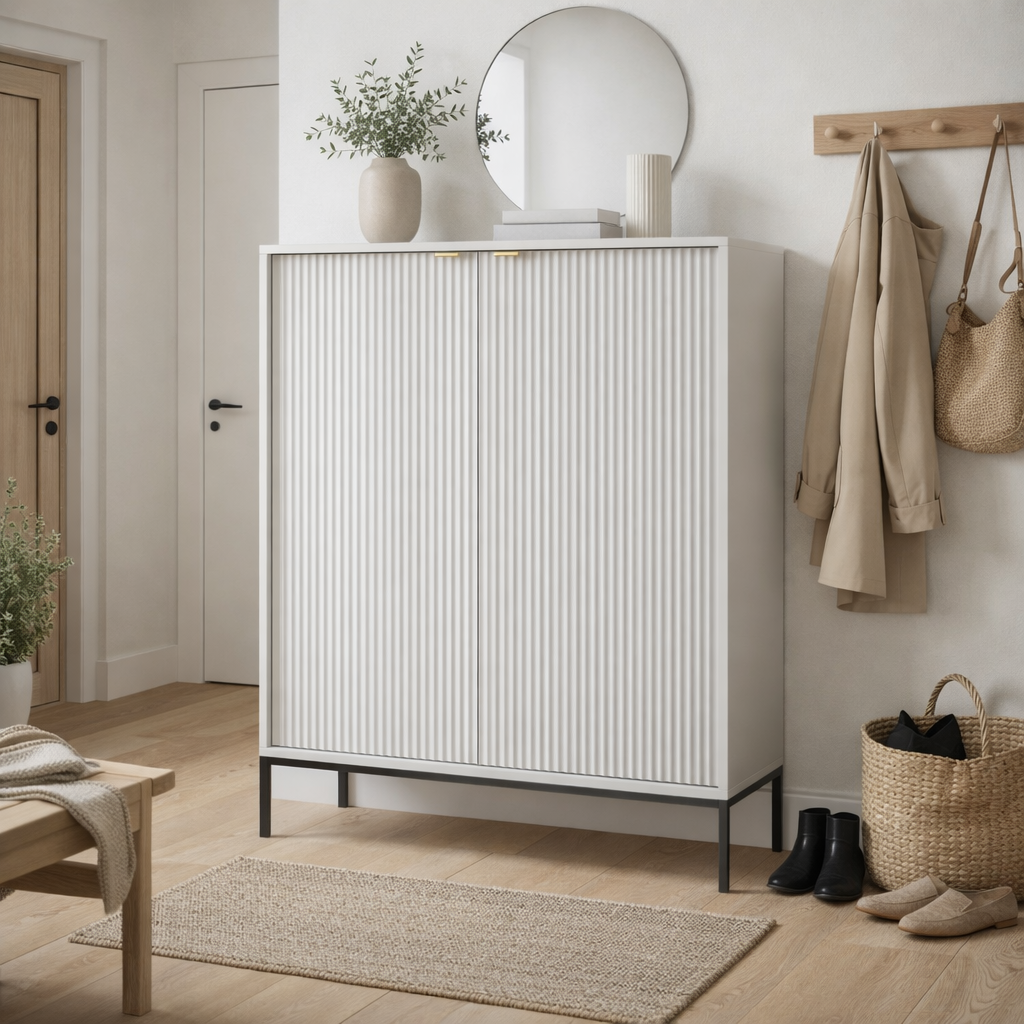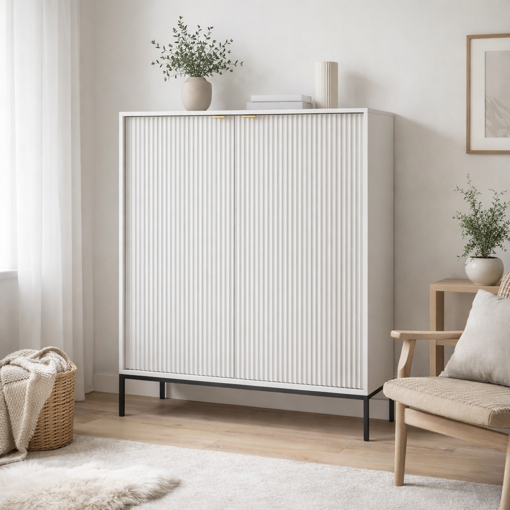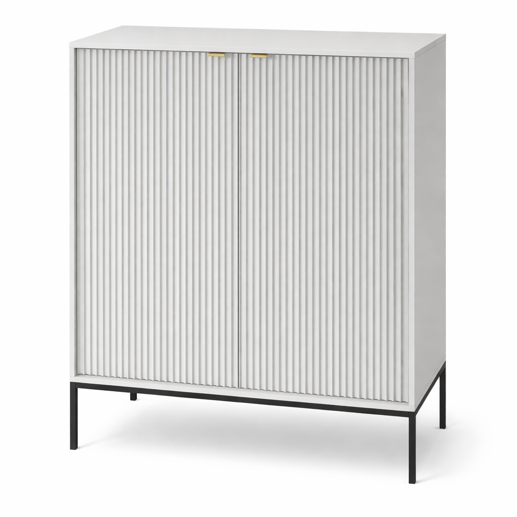 Charakterystyczne ryflowane fronty oraz geometryczna stalowa podstawa nadają meblowi wyjątkowego charakteru, wpisując go w najnowsze trendy wnętrzarskie. Komoda dostępna jest w aż 5 kolorach: kaszmirowym, białym, zielonym, czarnym i szarym, dzięki czemu łatwo dopasujesz ją do swojego wnętrza.