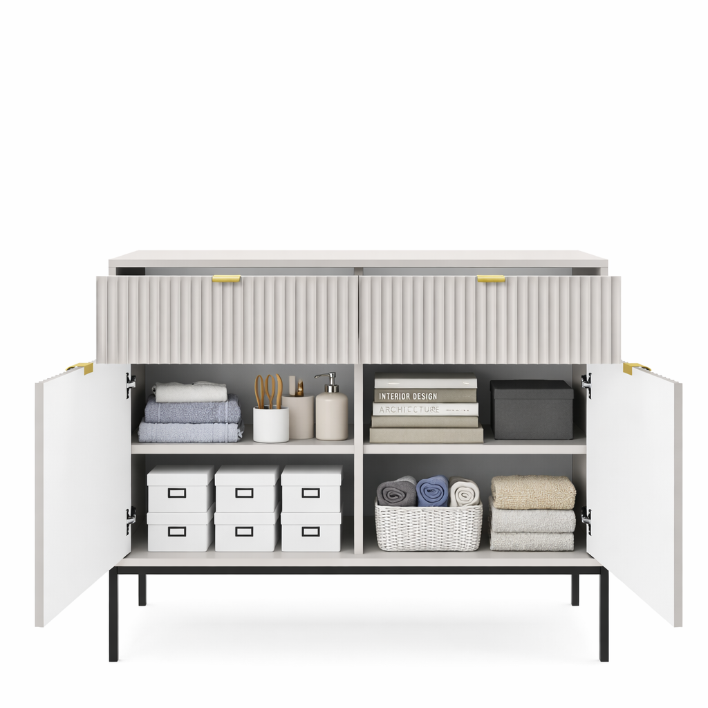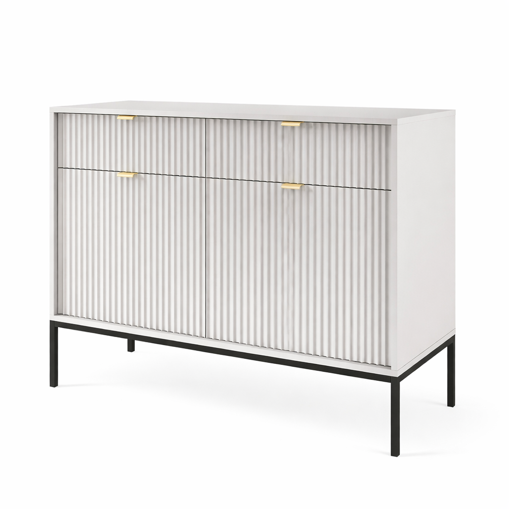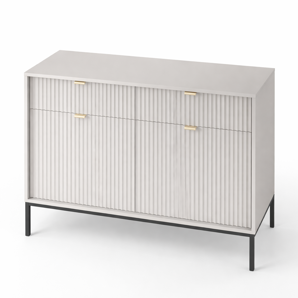 Komoda wyróżnia się ryflowanymi frontami oraz geometrycznym stalowym stelażem, dzięki czemu doskonale wpisuje się w nowoczesne, loftowe i industrialne aranżacje. Dostępna jest w 5 kolorach: kaszmirowym, białym, zielonym, czarnym i szarym, co daje możliwość idealnego dopasowania do wystroju Twojego domu.