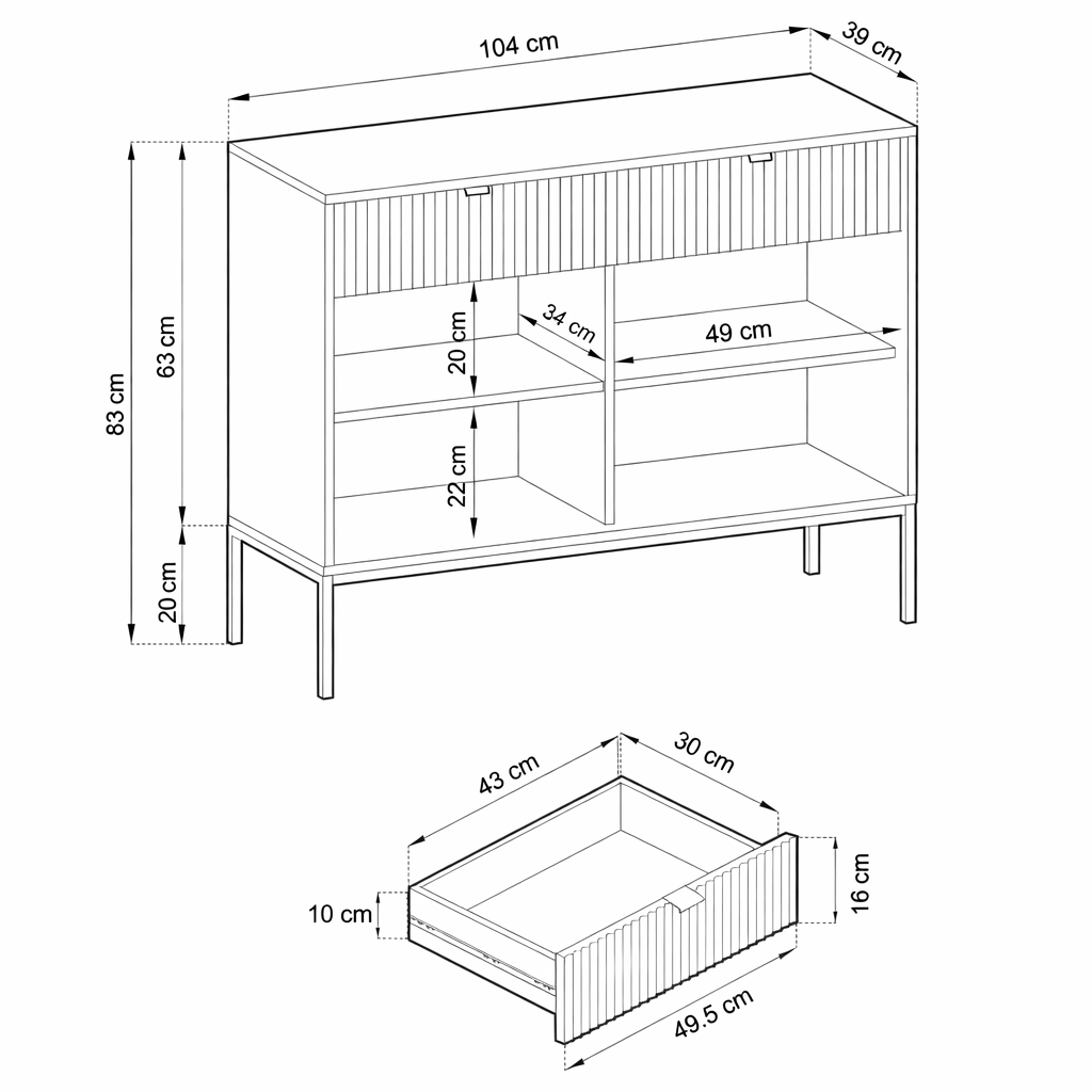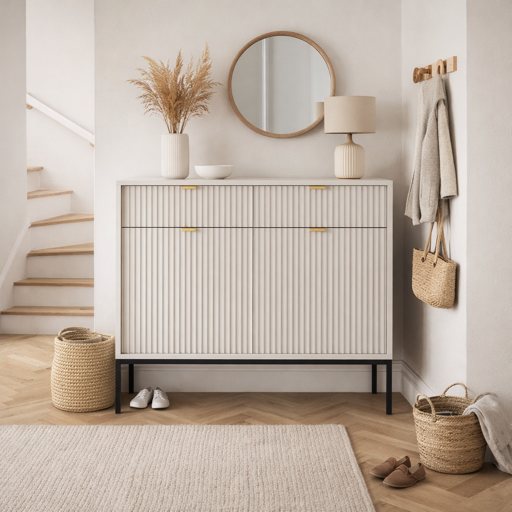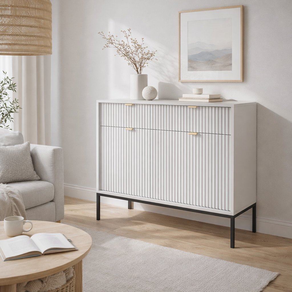Komoda wyróżnia się ryflowanymi frontami oraz geometrycznym stalowym stelażem, dzięki czemu doskonale wpisuje się w nowoczesne, loftowe i industrialne aranżacje. Dostępna jest w 5 kolorach: kaszmirowym, białym, zielonym, czarnym i szarym, co daje możliwość idealnego dopasowania do wystroju Twojego domu.
