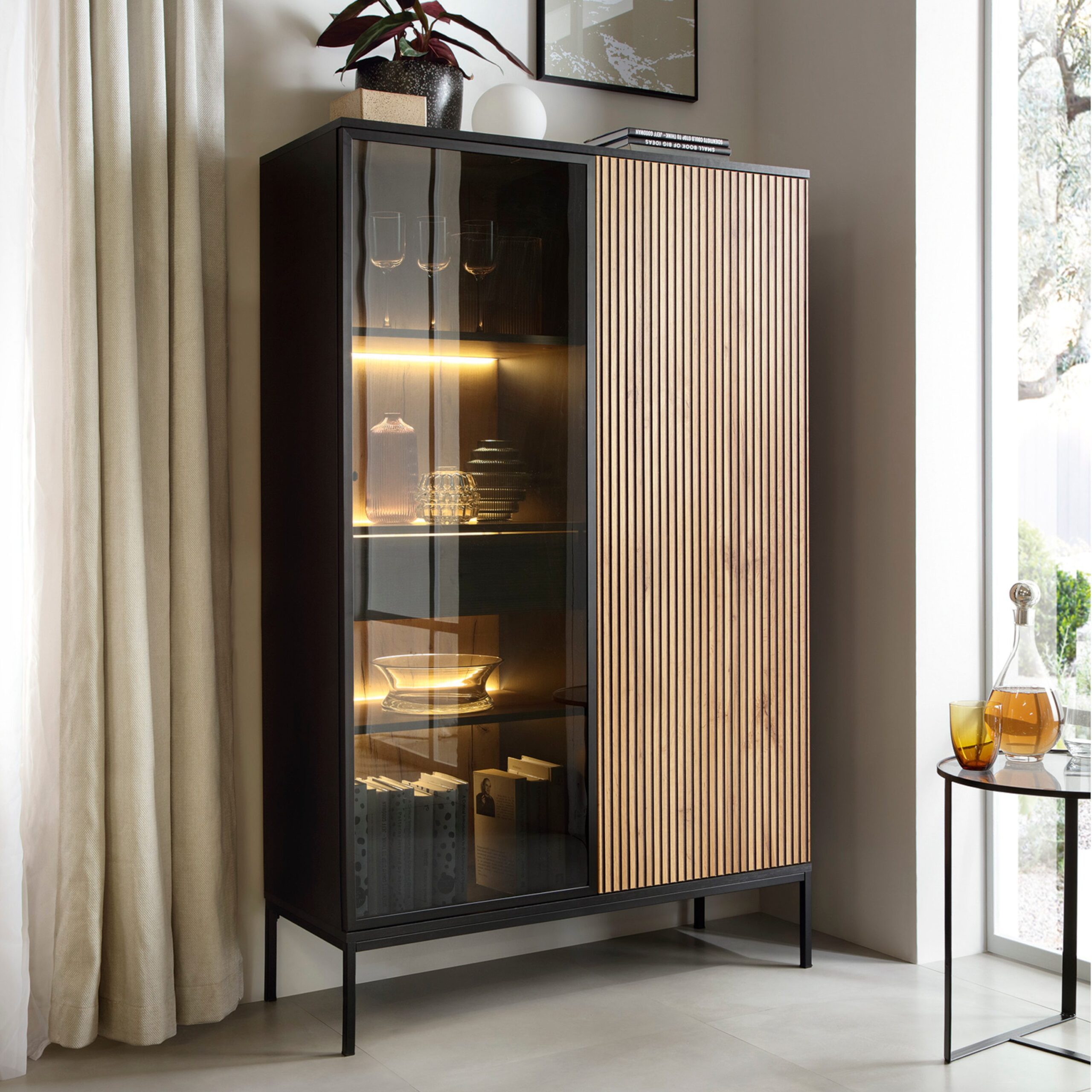 Laval WTSZ104 – witryna z oświetleniem LED, czarny, dąb wotan, lamela, szerokość 104 cm, wysokość 166 cm, głębokość 39 cm
