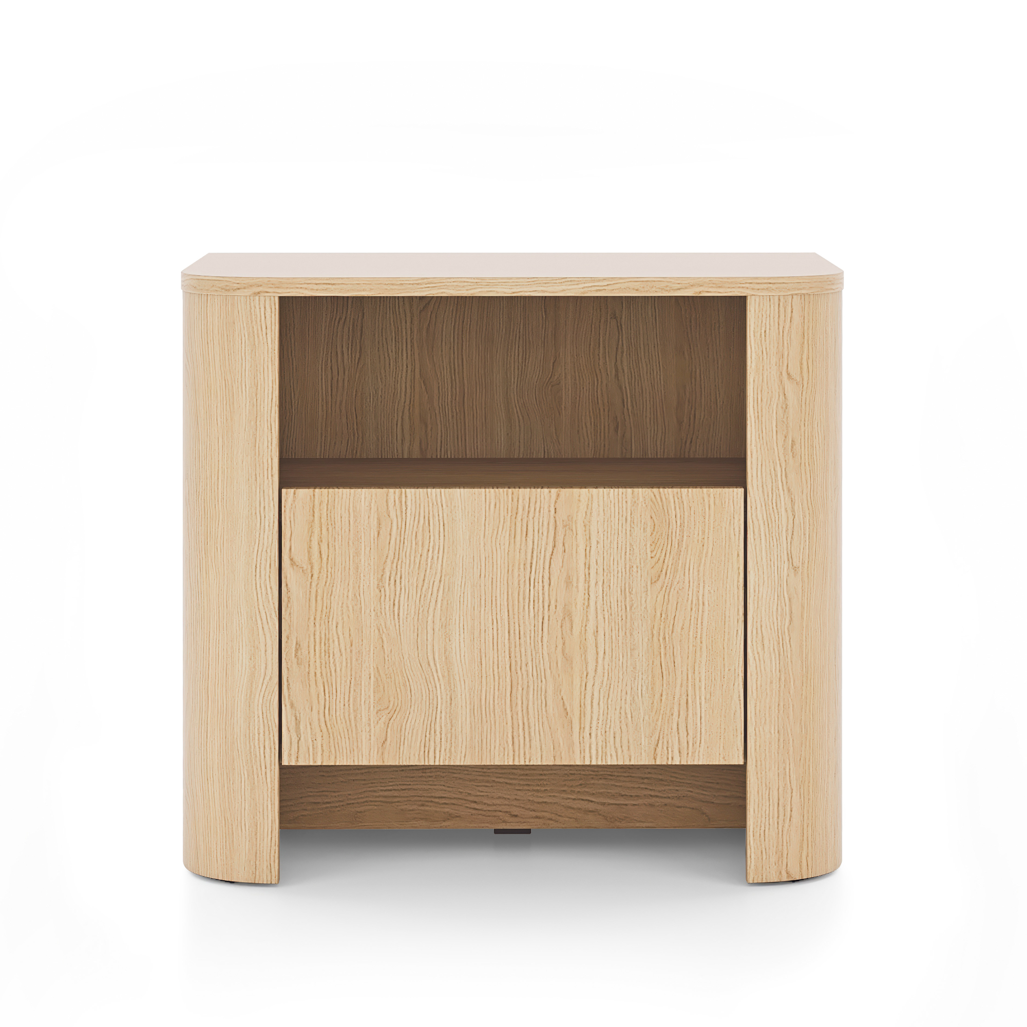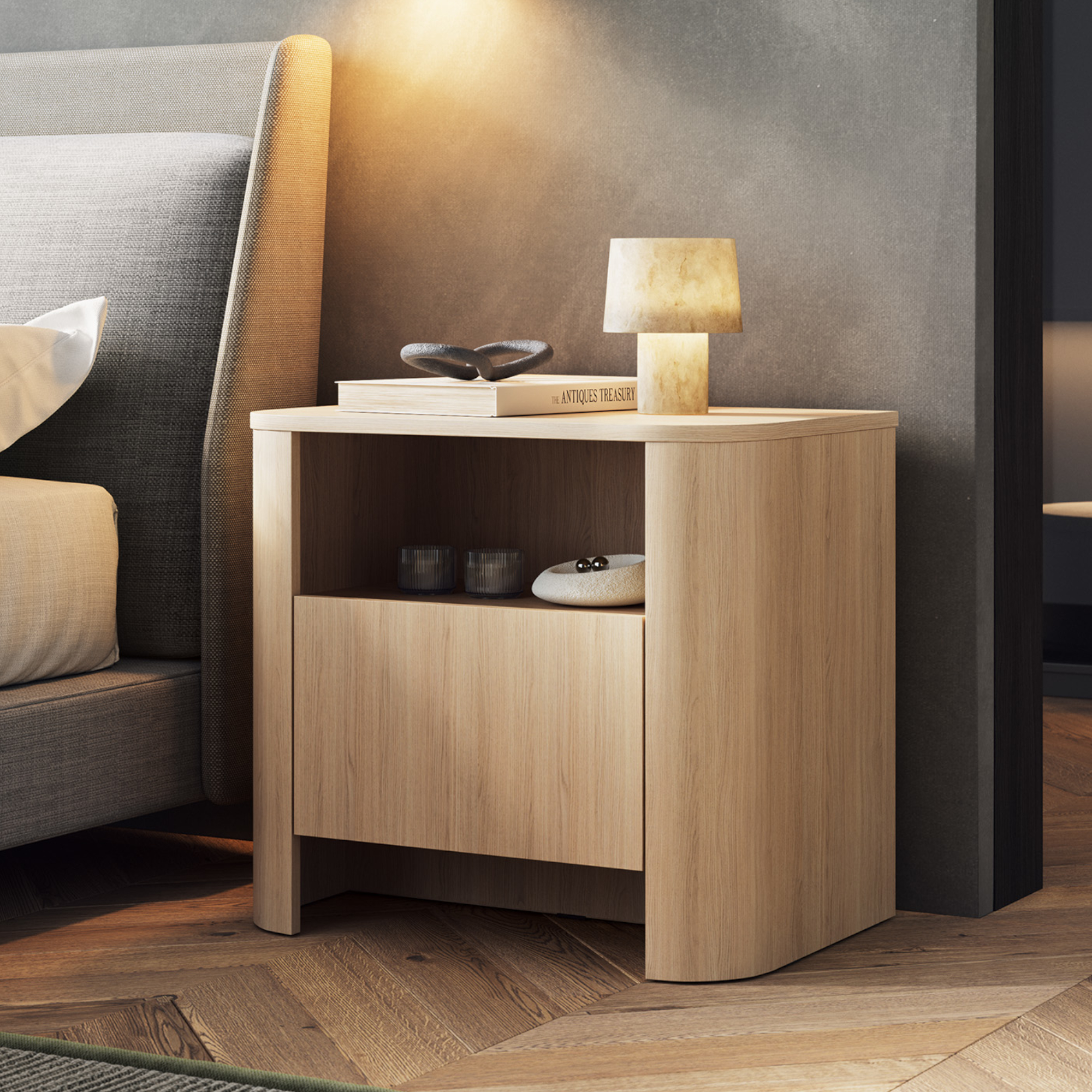 Charakterystycznym elementem są zaokrąglone boki z wytrzymałej płyty MDF o grubości 18 mm, które nadają bryle lekkości i modnego wyglądu. Gładki front podkreśla minimalistyczny charakter. Mebel wyposażono w jedną pojemną szufladę, która pomieści wszystkie drobiazgi potrzebne przed snem – książkę, okulary, ładowarkę czy kosmetyki. Szufladę otwiera się dzięki bezuchwytowemu systemowi push to open z funkcją cichego domyku, co zapewnia wygodę i komfort codziennego użytkowania.