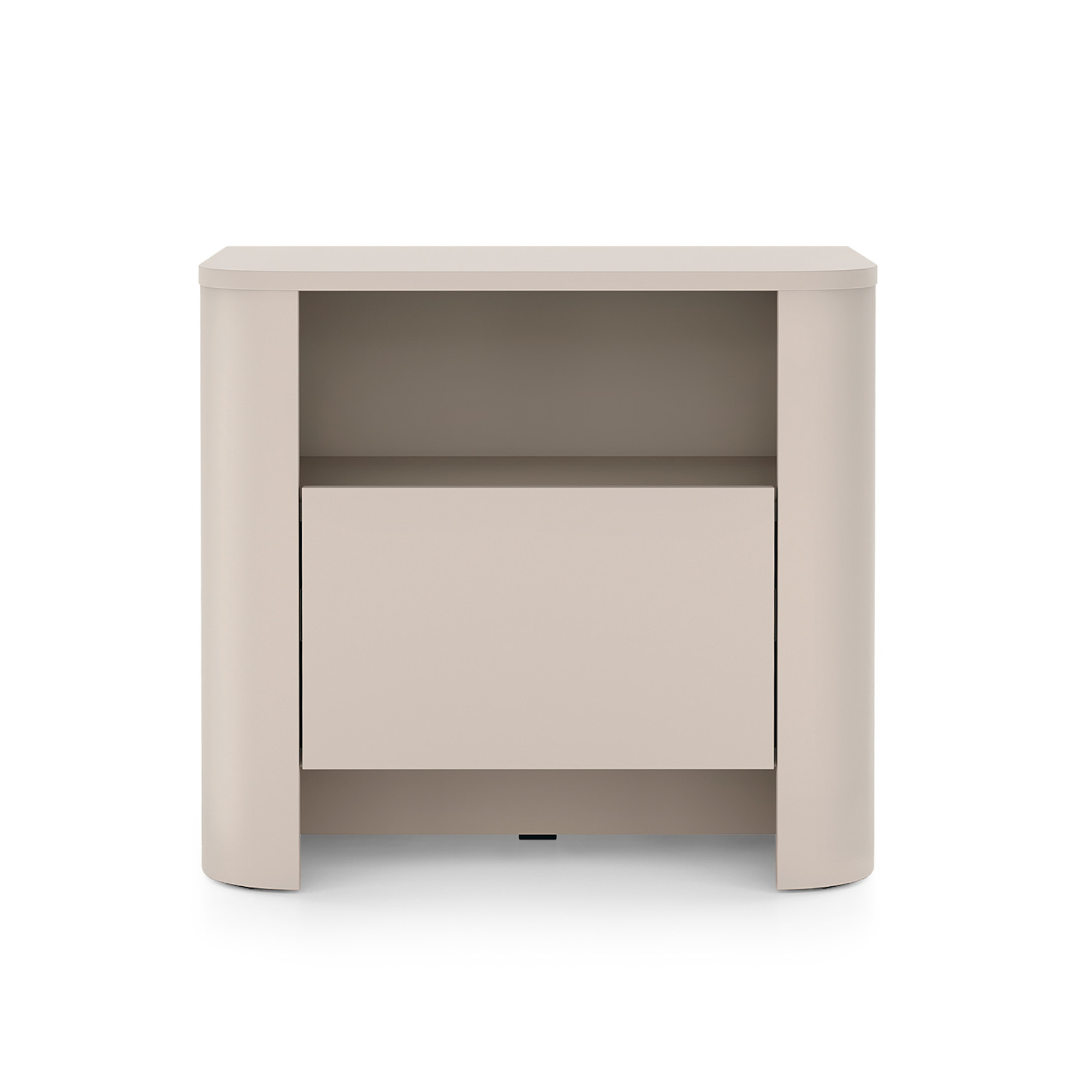 Charakterystycznym elementem są zaokrąglone boki z wytrzymałej płyty MDF o grubości 18 mm, które nadają bryle lekkości i modnego wyglądu. Gładki front podkreśla minimalistyczny charakter. Mebel wyposażono w jedną pojemną szufladę, która pomieści wszystkie drobiazgi potrzebne przed snem – książkę, okulary, ładowarkę czy kosmetyki. Szufladę otwiera się dzięki bezuchwytowemu systemowi push to open z funkcją cichego domyku, co zapewnia wygodę i komfort codziennego użytkowania.