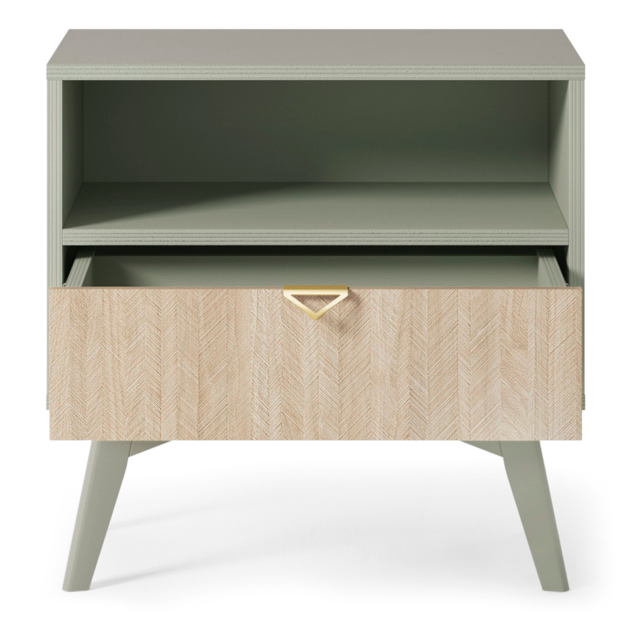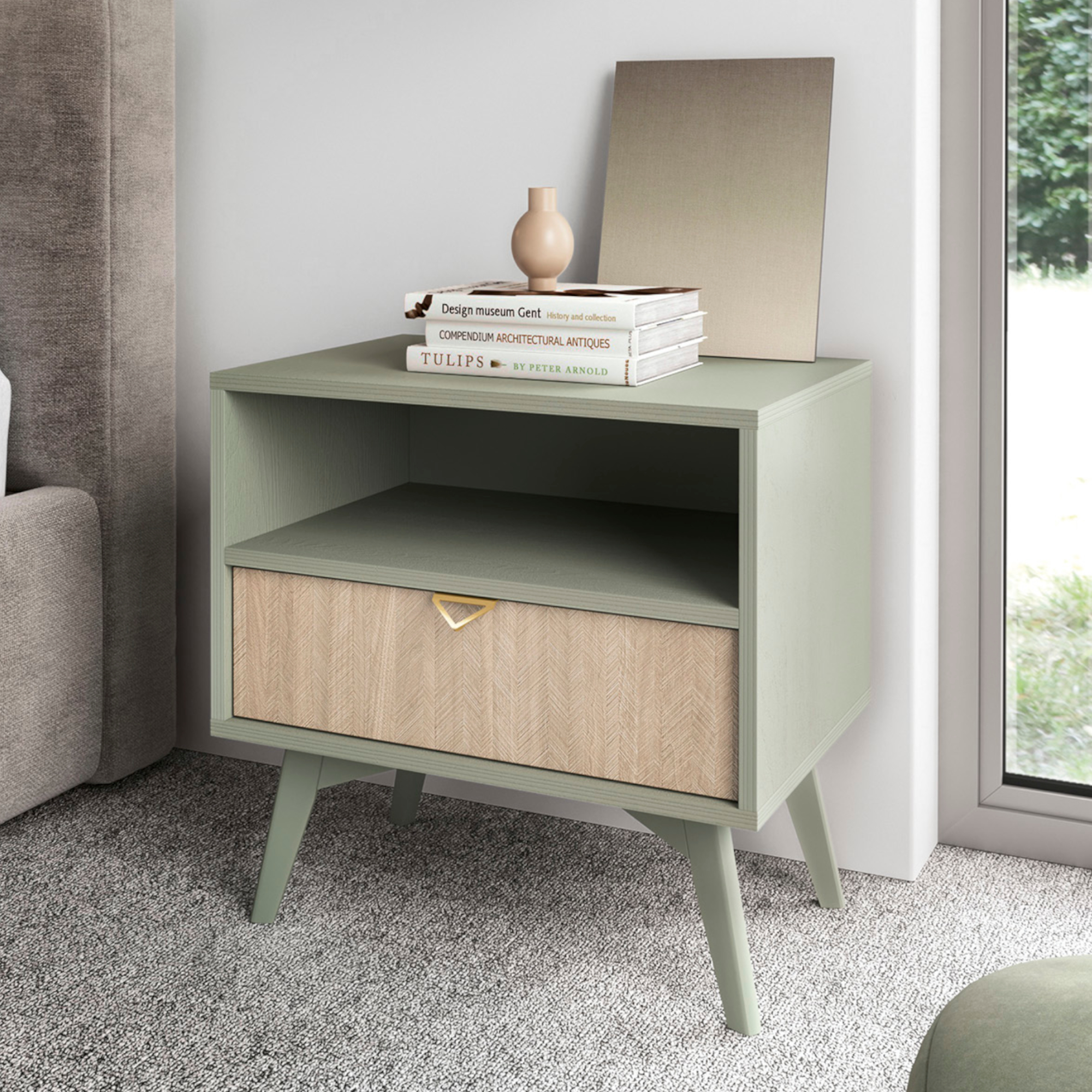 Nocna Szafka TOFINO – Dąb – Zielony – Metalowe Uchwyty – Szuflada – Szerokość 54 cm, Wysokość 54 cm, Głębokość 38 cm