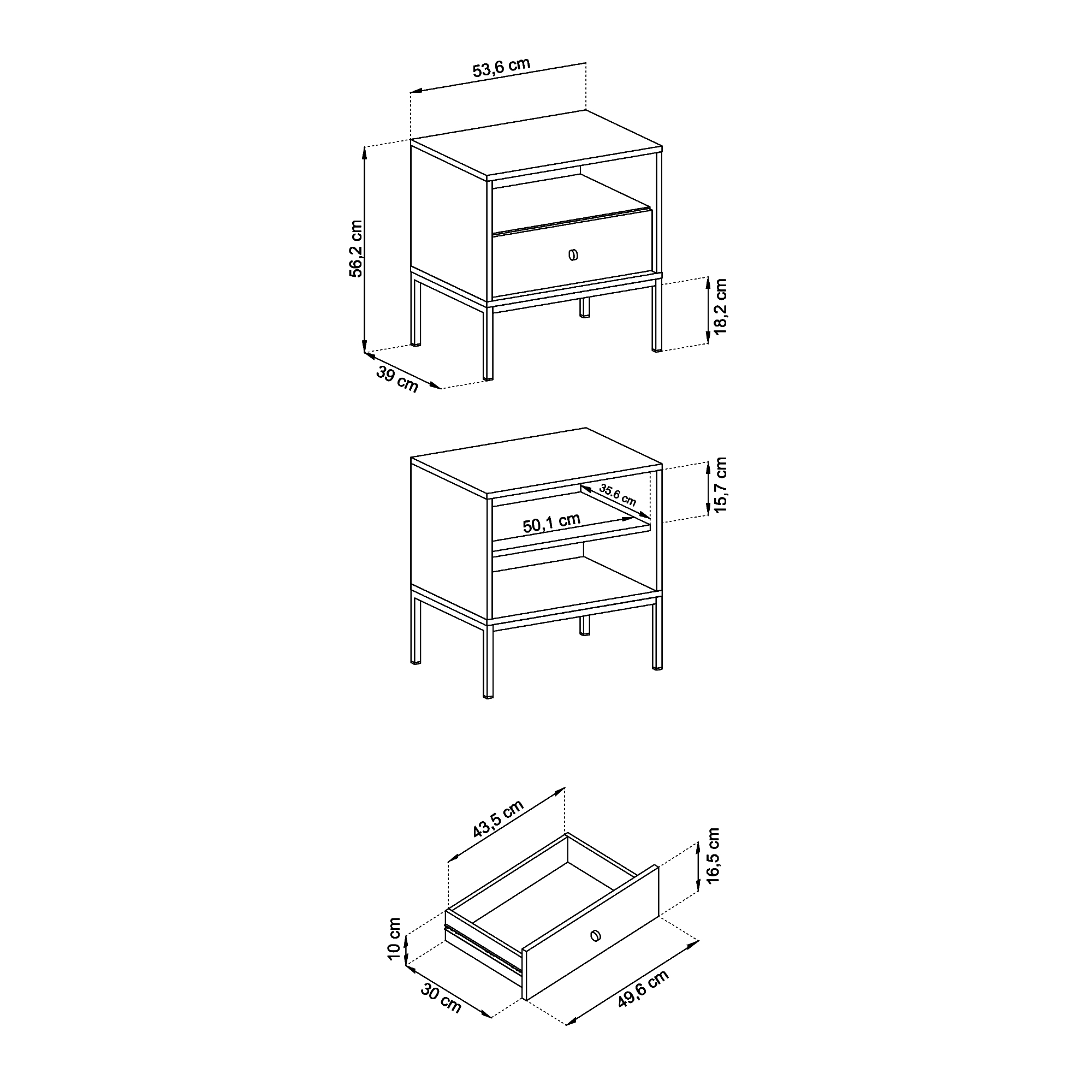Dzięki pojemnej szufladzie i otwartej wnęce zyskujesz praktyczne miejsce na najpotrzebniejsze przedmioty – książkę, telefon, krem czy okulary. Z kolei blat świetnie sprawdzi się jako podstawa dla lampki nocnej, budzika czy dekoracji, tworząc w sypialni przytulny klimat.