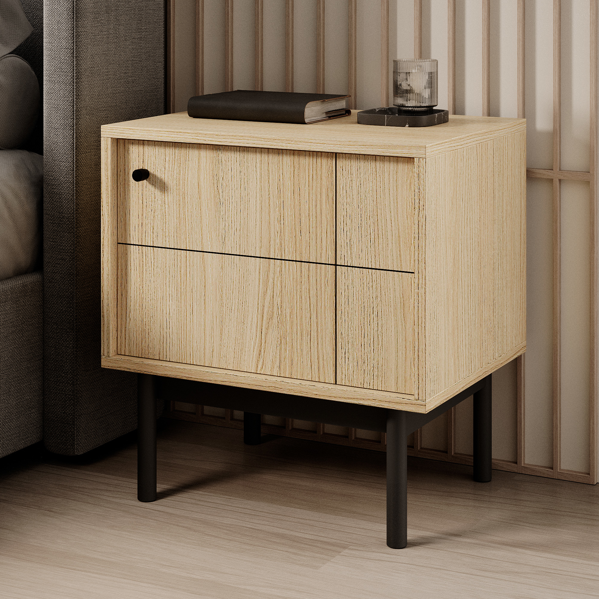 Stolik Nocny DIEPPE – Dąb – Metalowe Uchwyty – Drewniane Nogi – Szerokość 56 cm, Wysokość 56 cm, Głębokość 39 cm