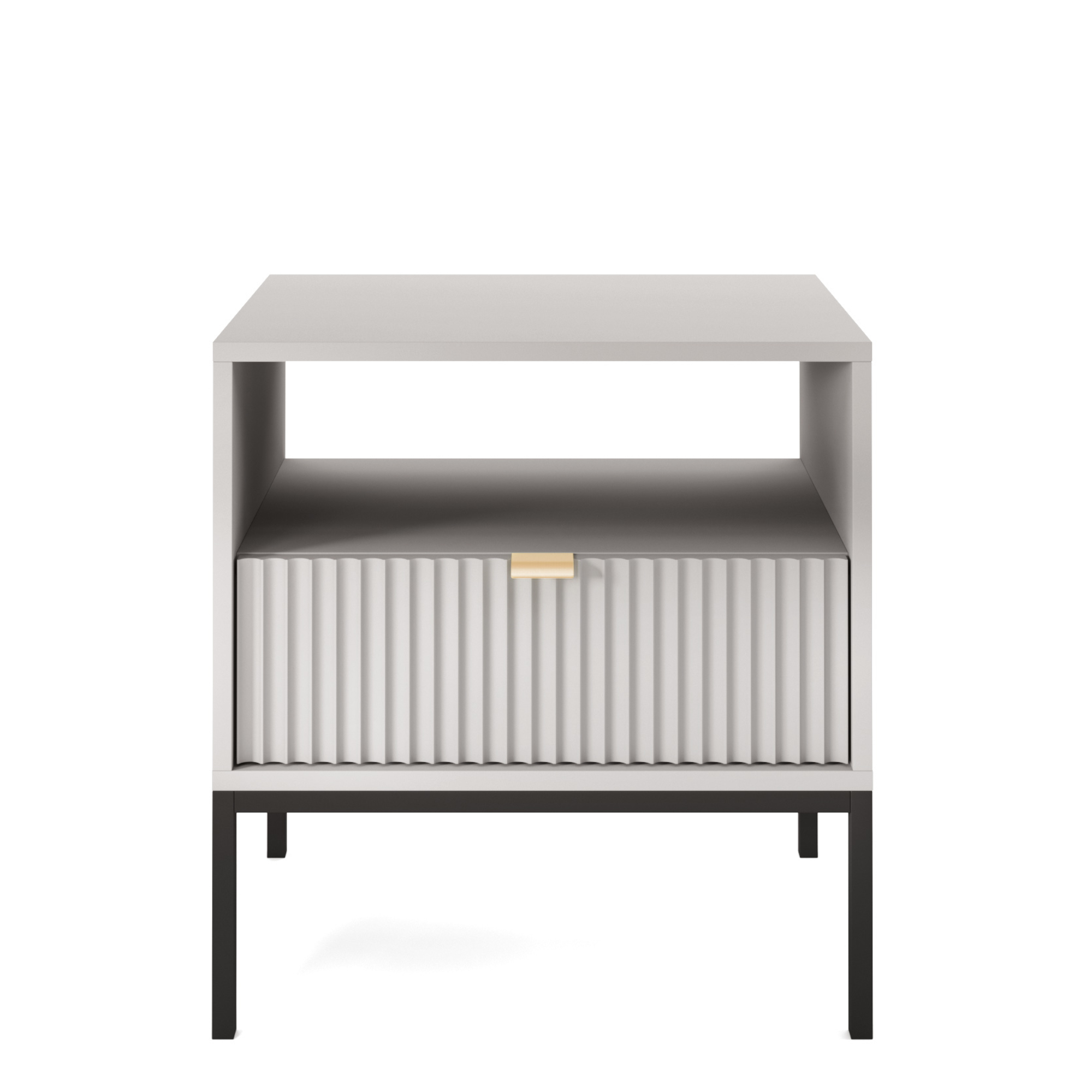 Szafka wyróżnia się eleganckim wyglądem – ryflowany front, stalowy, geometryczny stelaż i uchwyt ze szczotkowanego aluminium tworzą efektowną całość, która doda sypialni wyjątkowego charakteru. Mebel dostępny jest w aż 5 kolorach: kaszmirowym, białym, zielonym, czarnym i szarym, co pozwala dopasować go do różnych aranżacji.