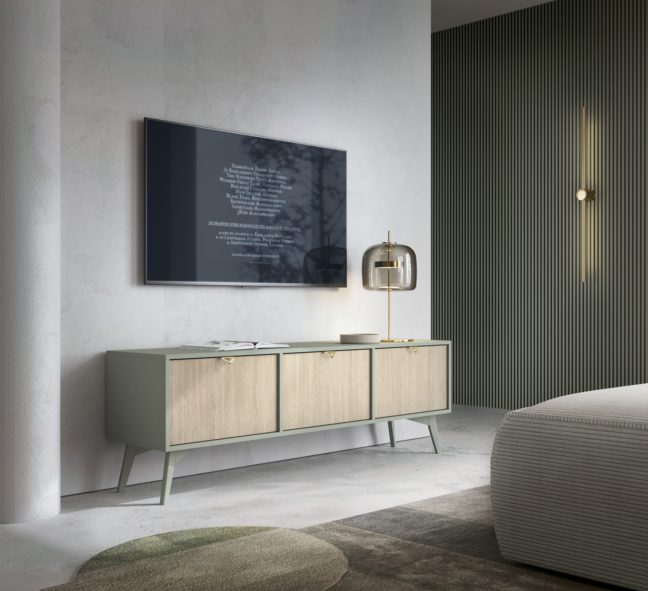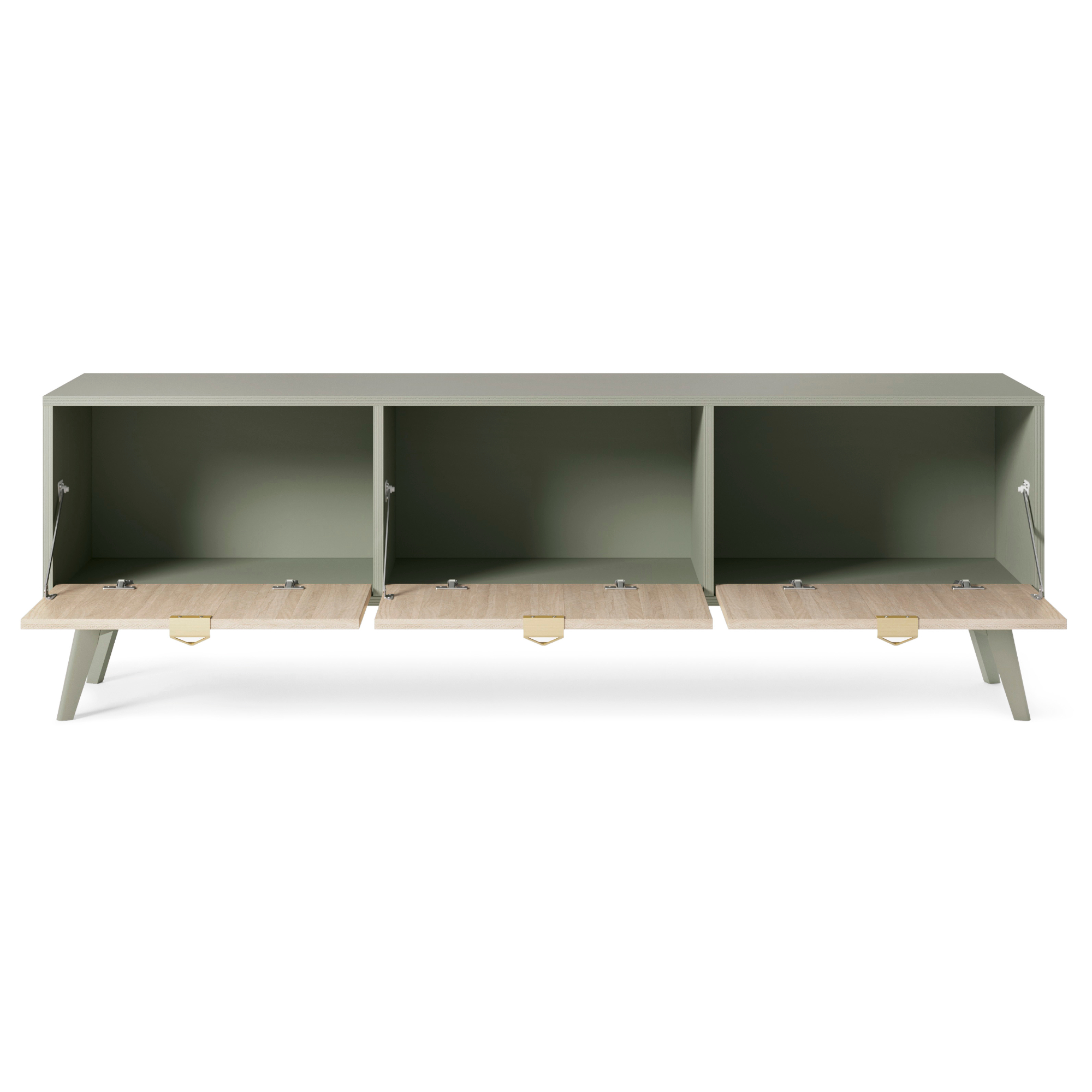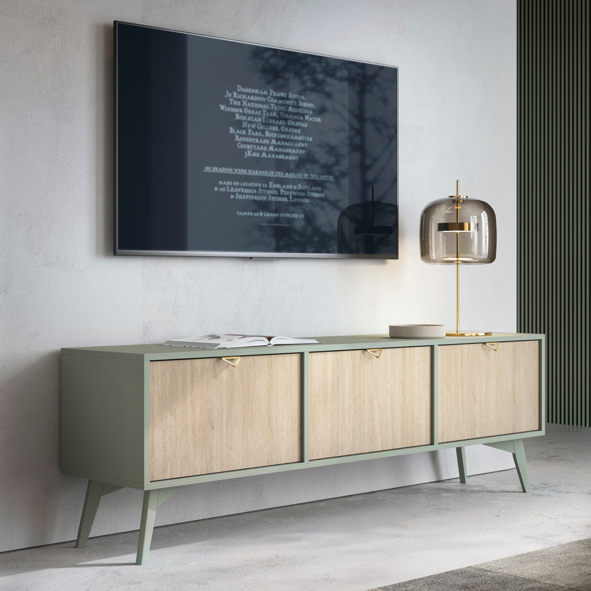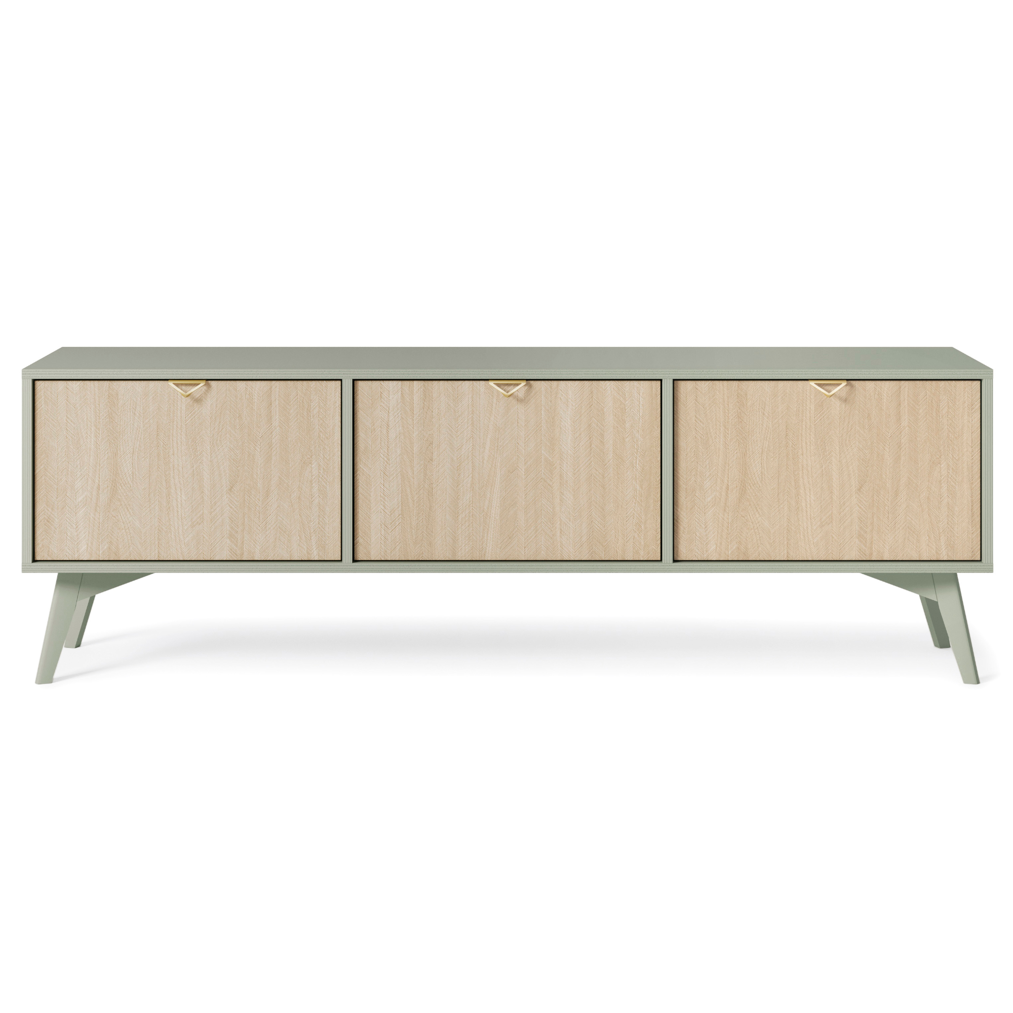 Szafka pod telewizor Tofino – Dąb – Zielony – Metalowe Uchwyty – Drewniane Nogi – Szerokość 158 cm, Wysokość 52 cm, Głębokość 38 cm