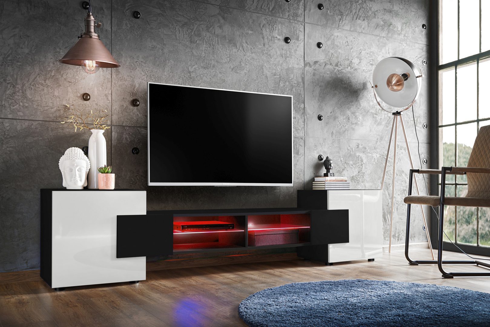 Szafka RTV Merano, Czarny/Biały Oświetlenie LED RGB