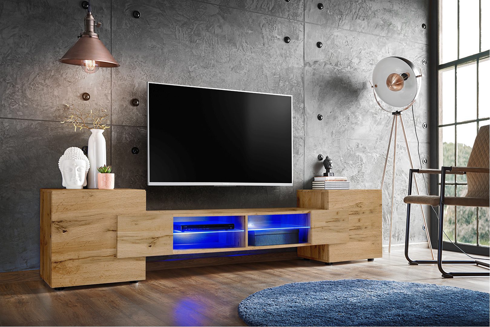 W centralnej strefie znajdują się 4 wnęki, przedzielone 2 szklanymi półkami (z opcjonalnym oświetleniem LED), idealne do ekspozycji sprzętu RTV i zapewnienia łatwego dostępu do niego.