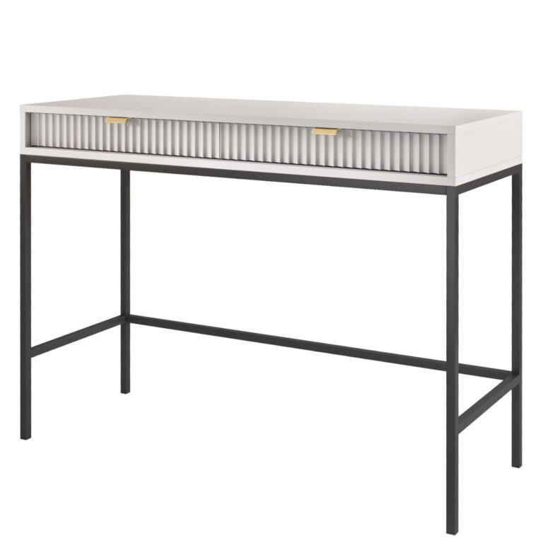 Metalowe nóżki w kolorze czarnym stabilnie podtrzymują całą bryłę, dodając jej nowoczesnego charakteru i ułatwiając sprzątanie pod meblem. Dwie pojemne szuflady pomieszczą wszystkie akcesoria kosmetyczne, biżuterię i drobiazgi, które warto mieć zawsze pod ręką. Frezowane uchwyty stanowią elegancki detal, który łączy funkcjonalność z nowoczesną estetyką, a prowadnice z dociągiem gwarantują płynne i ciche otwieranie.