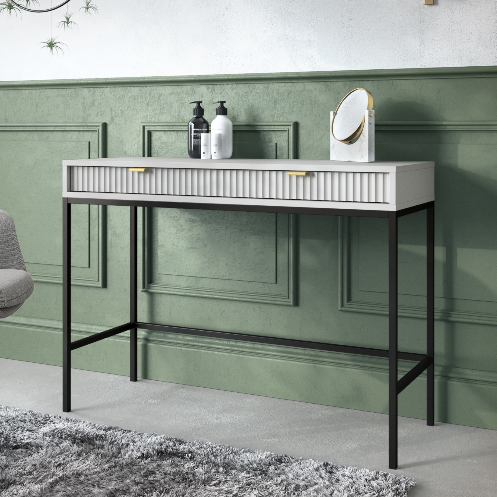 Toaletka NANAIMO – Szara – Złote Uchwyty – Dwie Szuflady – Szerokość 104 cm, Wysokość 77 cm, Głębokość 50 cm