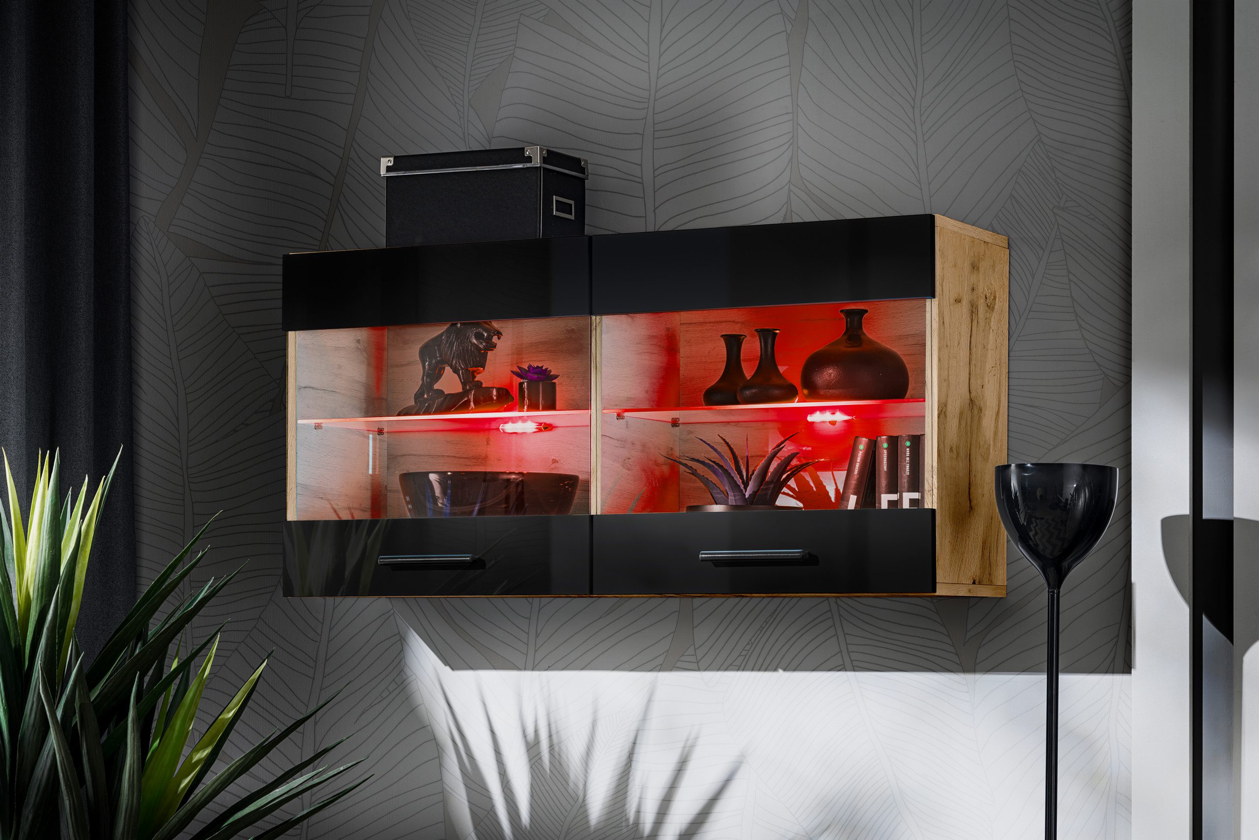 Witryna Półka Wisząca Savona, Czarny/Wotan Oświetlenie LED RGB