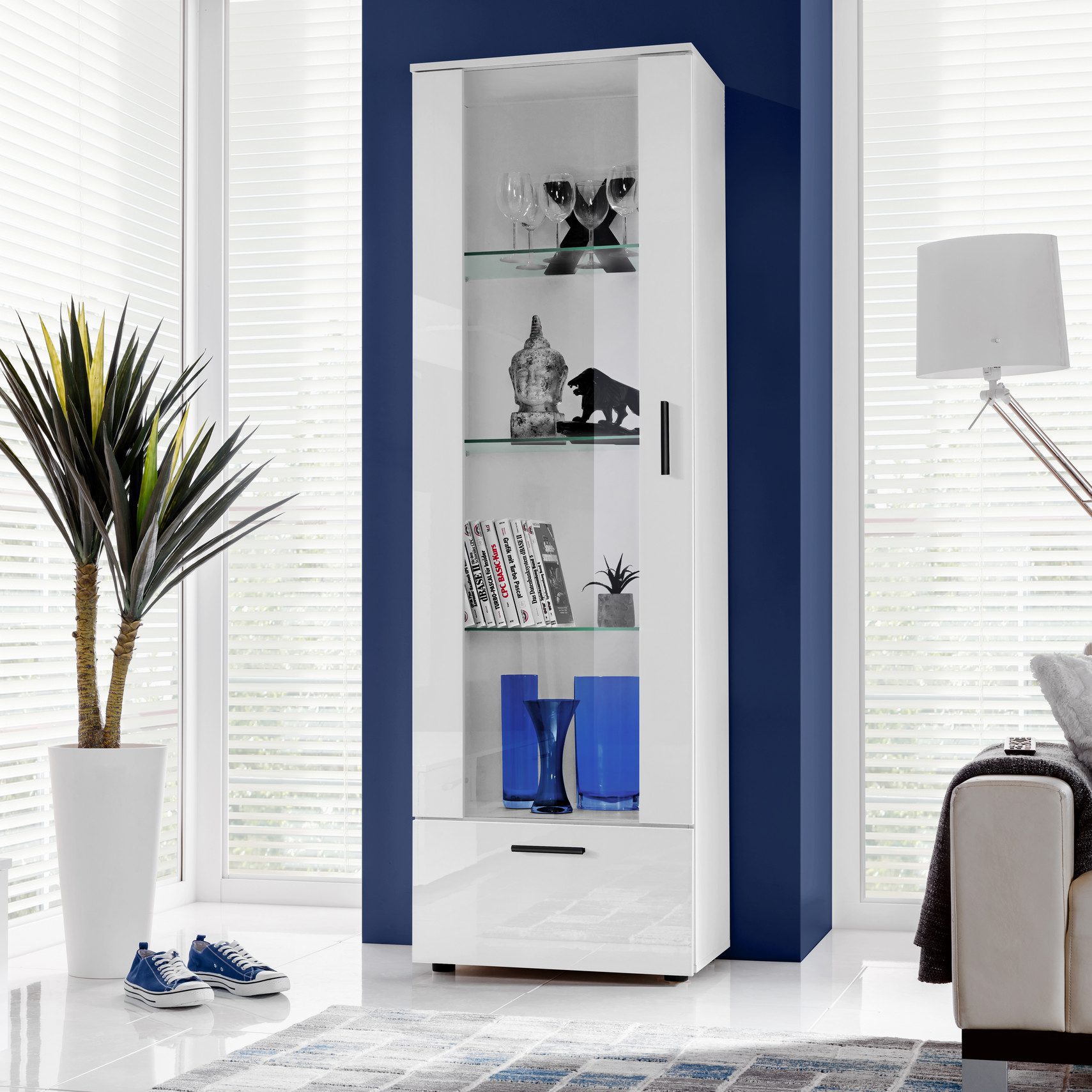 Witryna Alessandria: 3 szklane półki, 1 półka z płyty laminowanej. Opcjonalne oświetlenie LED. Wykonana z płyty laminowanej, odpornej na ścieranie, zarysowania i odbarwienia