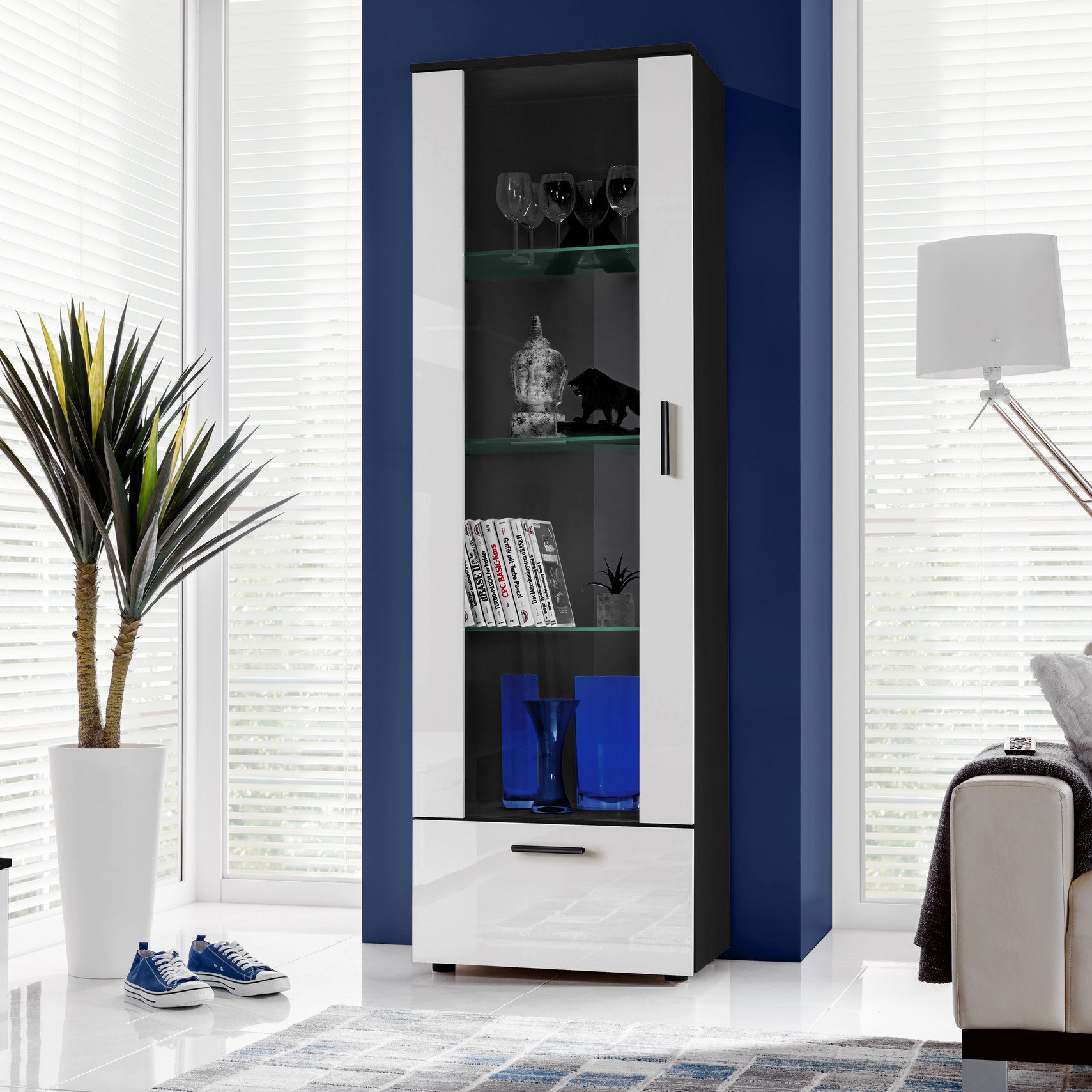 Geometryczne kształty i kąty proste nadają witrynie Alessandria czysty, nowoczesny i elegancki wygląd. Mebel pasuje do szerokiej gamy stylów wnętrz,