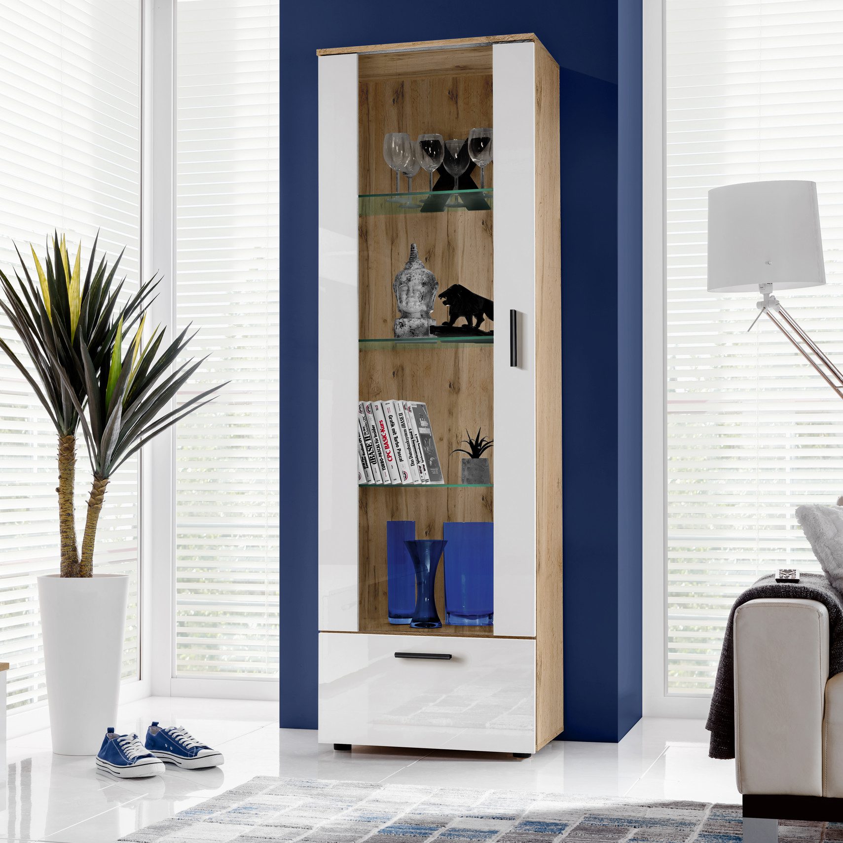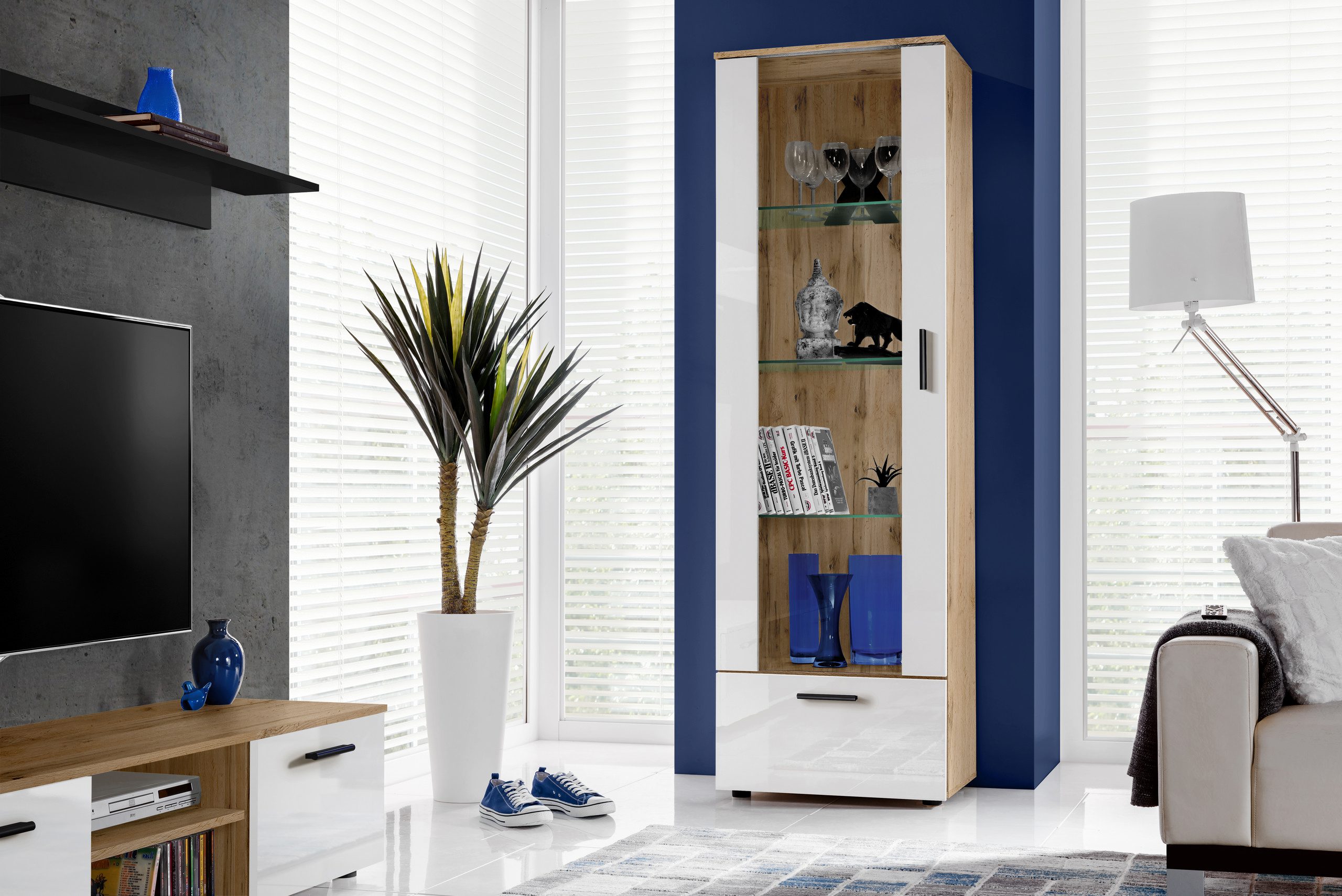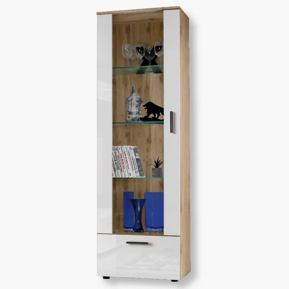 Witryna Alessandria: 3 szklane półki, 1 półka z płyty laminowanej. Opcjonalne oświetlenie LED. Wykonana z płyty laminowanej, odpornej na ścieranie, zarysowania i odbarwienia
