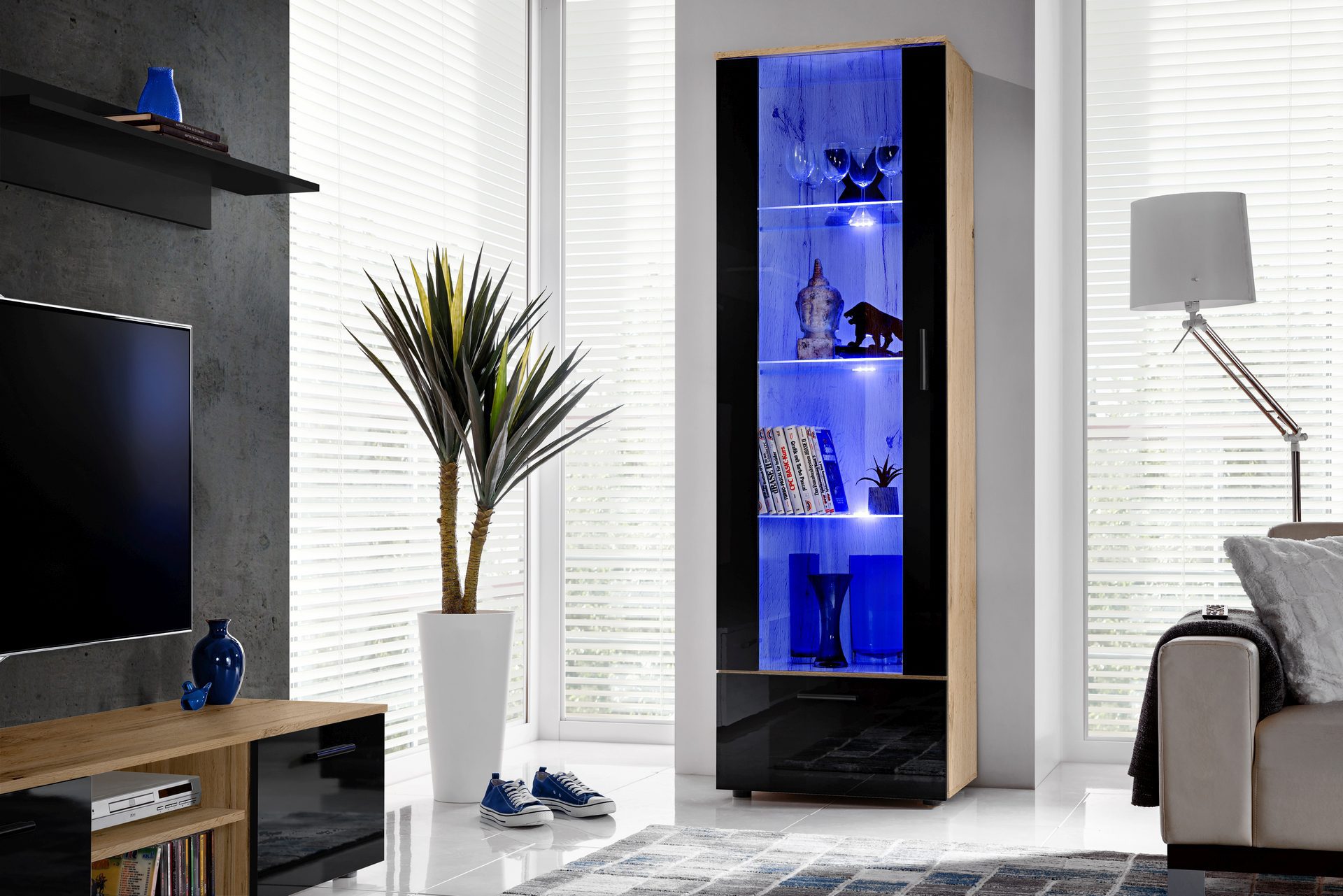 Witryna Stojąca Alessandria, Czarny/Wotan Oświetlenie LED Niebieskie