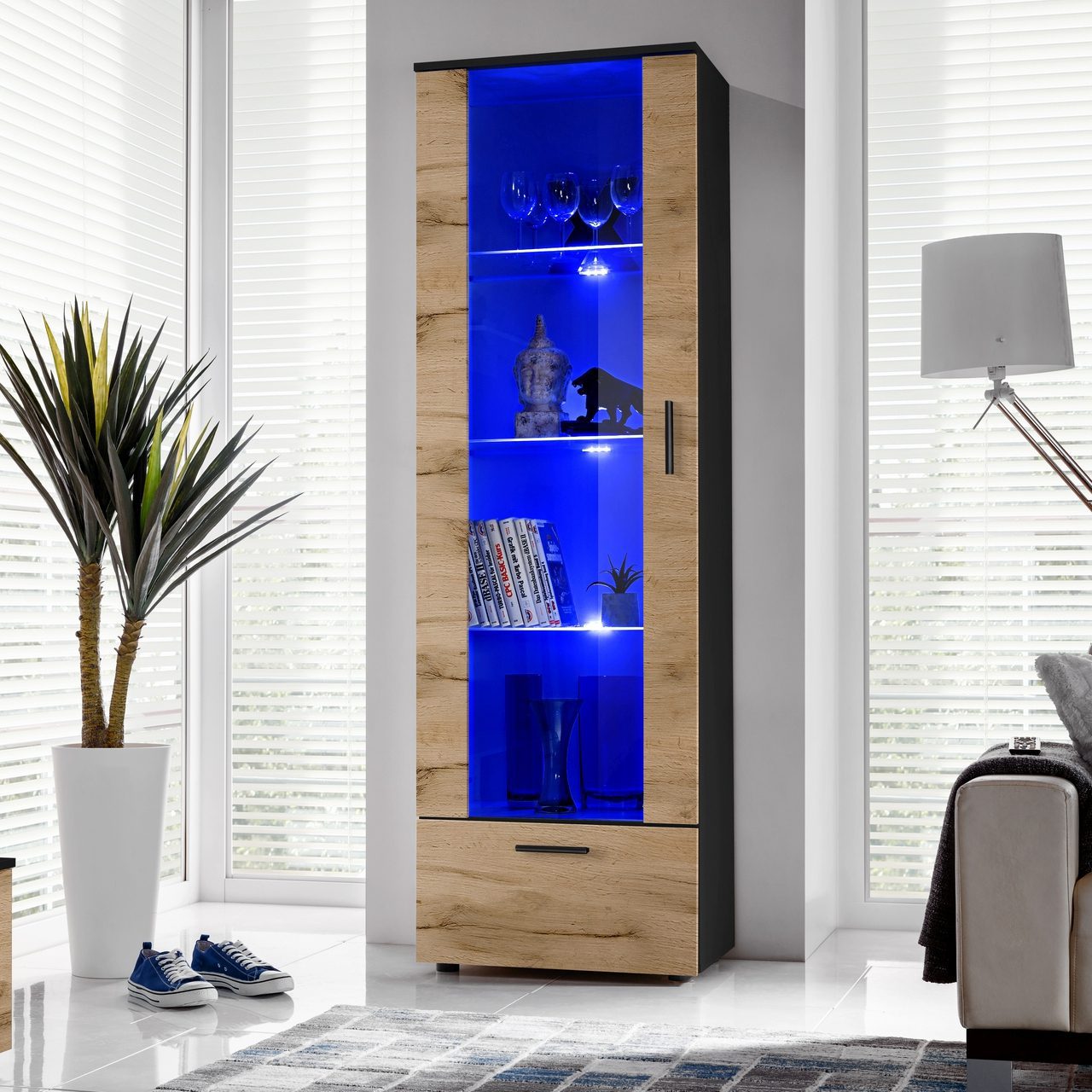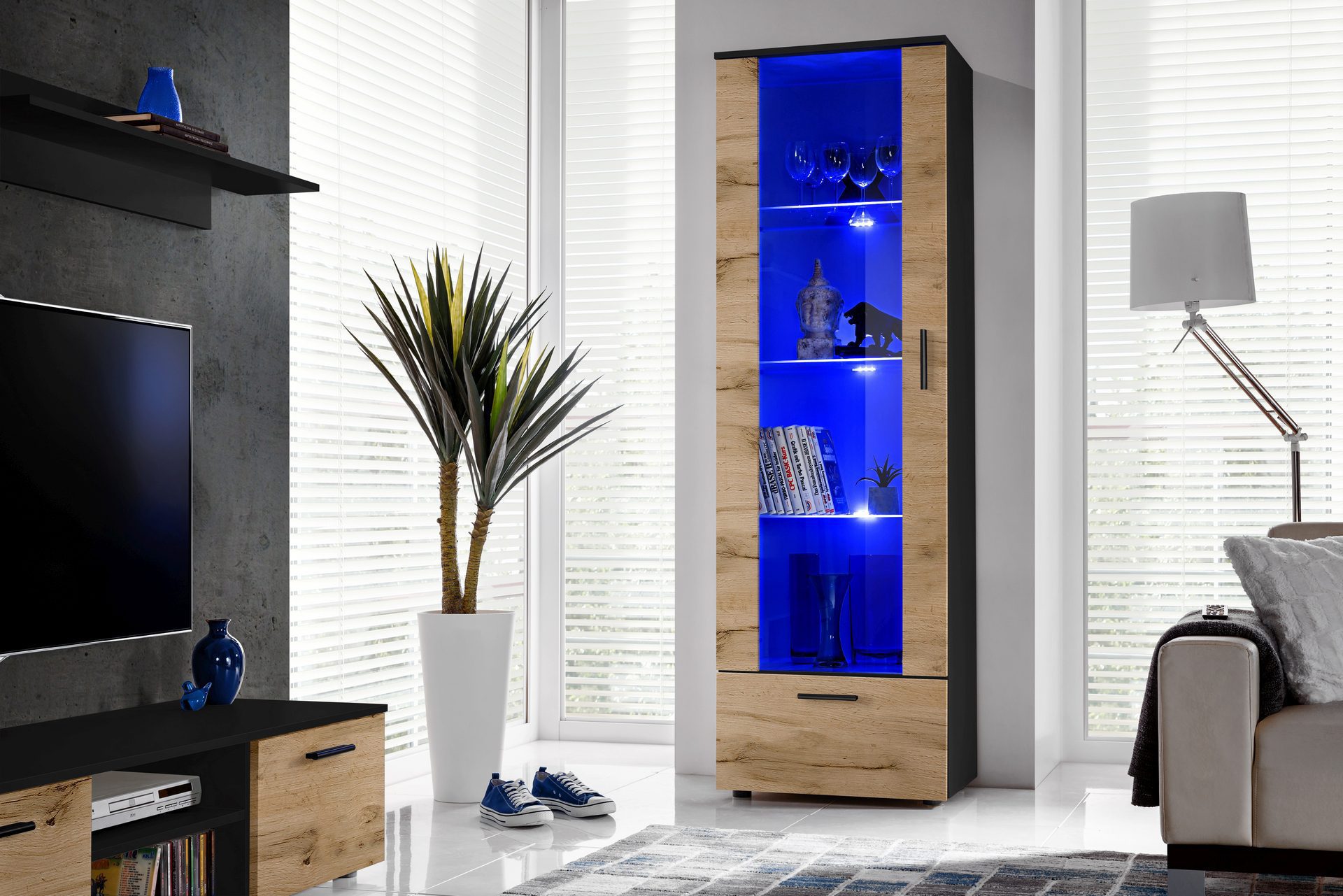 Witryna Stojąca Alessandria, Wotan/Czarny Oświetlenie LED Niebieskie