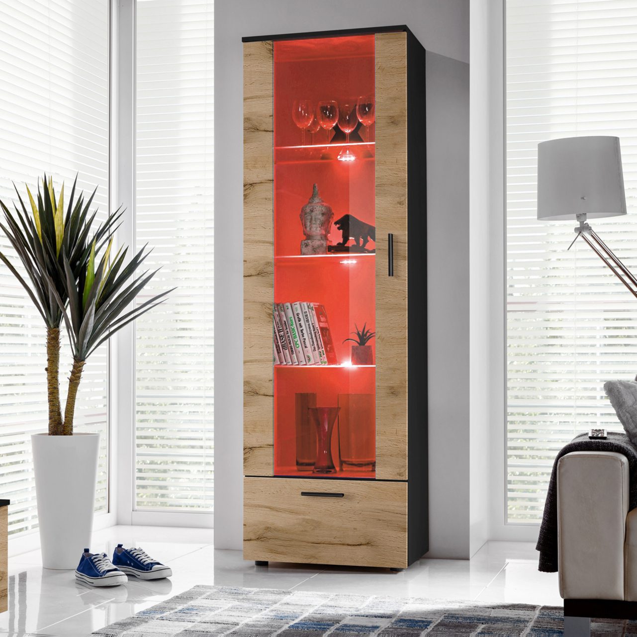 Witryna Alessandria: 3 szklane półki, 1 półka z płyty laminowanej. Opcjonalne oświetlenie LED. Wykonana z płyty laminowanej, odpornej na ścieranie, zarysowania i odbarwienia