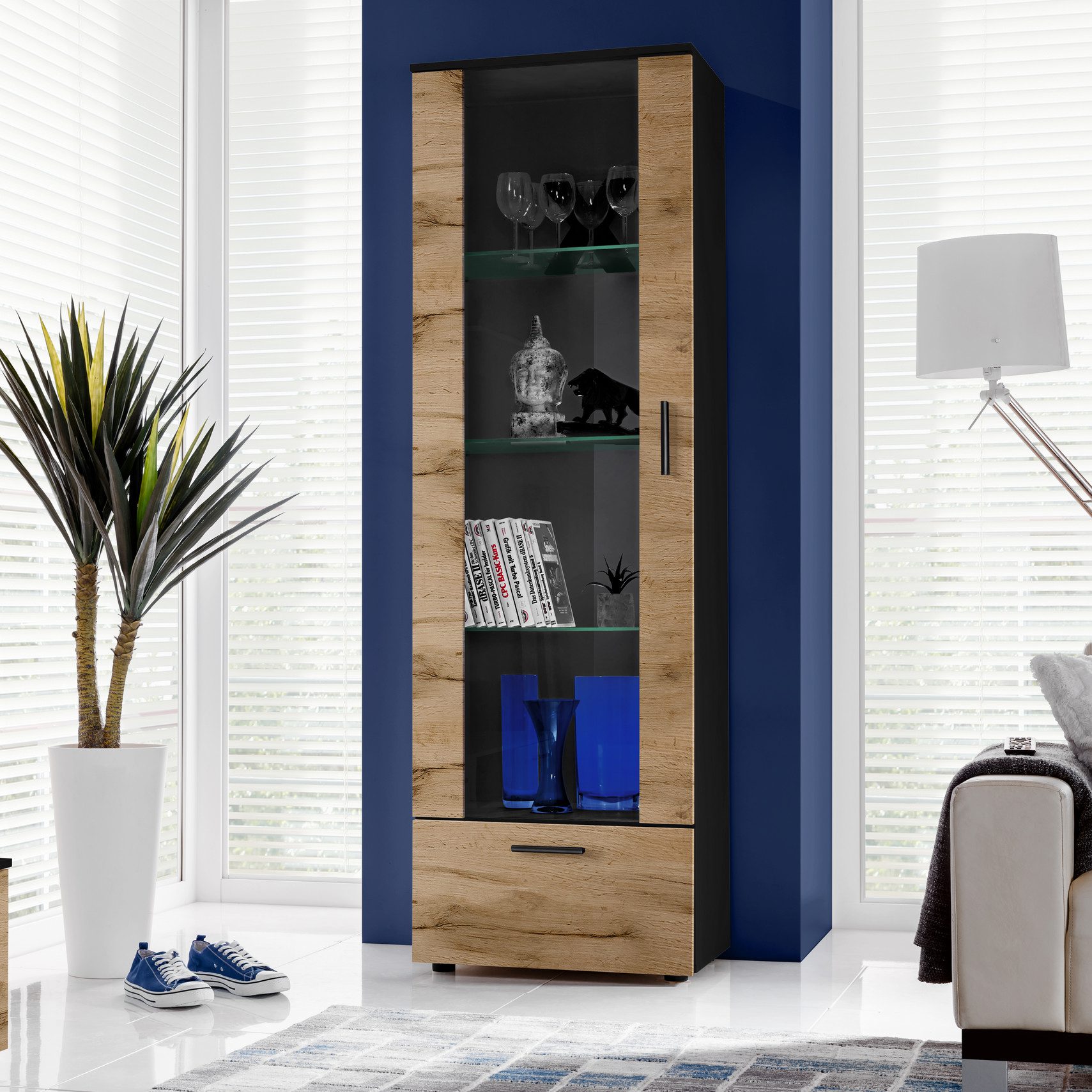 Witryna Alessandria: 3 szklane półki, 1 półka z płyty laminowanej. Opcjonalne oświetlenie LED. Wykonana z płyty laminowanej, odpornej na ścieranie, zarysowania i odbarwienia