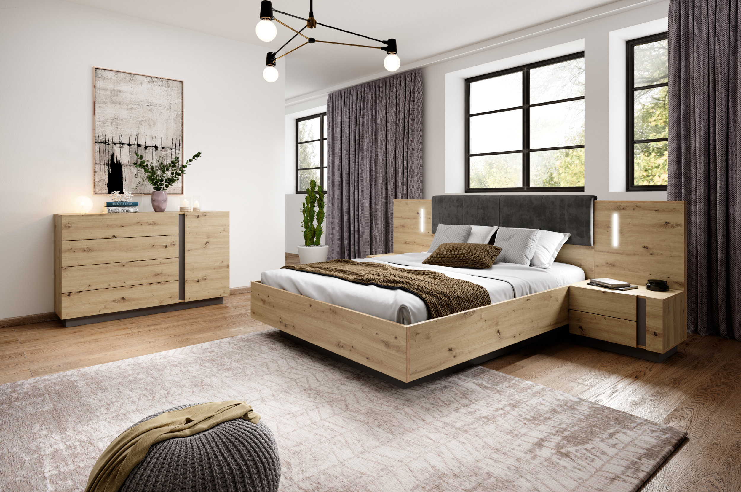 Kolekcja mebli ANDEBU to propozycja dla osób, które chcą wprowadzić do swojego wnętrza naturalne ciepło drewna w nowoczesnym wydaniu. Harmonijne połączenie dekorów inspirowanych dębem z kontrastującymi, stonowanymi kolorami tworzy elegancką i wyrazistą całość, idealną do współczesnych salonów oraz przestrzeni dziennych.