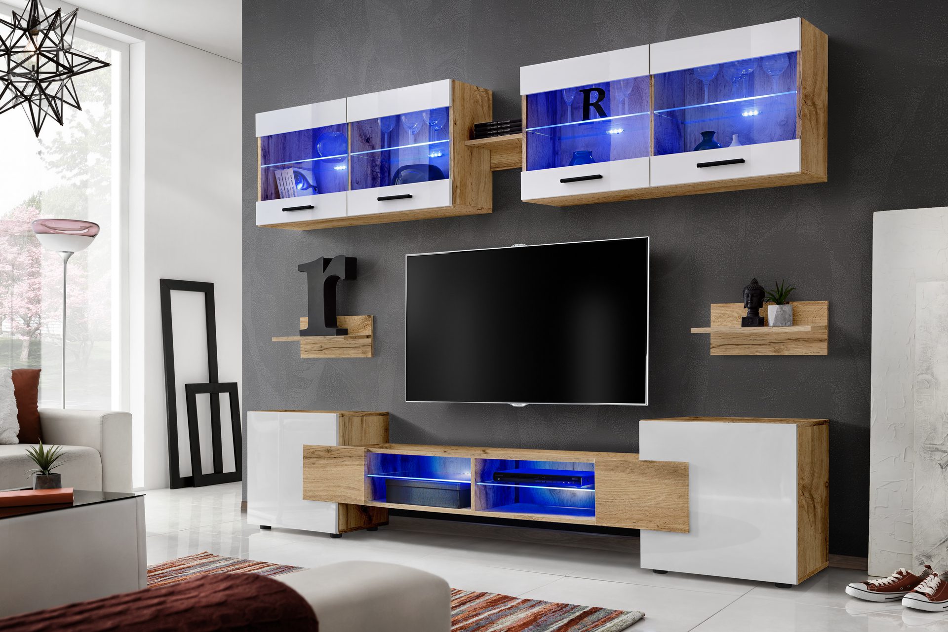 Zestaw Mebli RTV Foggia, Biały/Wotan Oświetlenie LED Niebieskie