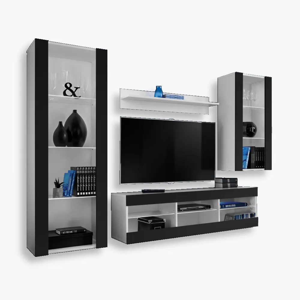 DUŻO MIEJSCA DO PRZECHOWYWANIA: Zestaw składa się z 2 witryn, półki i szafki RTV. Jest wystarczająco dużo miejsca na książki, porcelanę, płyty, dokumenty lub ulubioną kolekcję pamiątek, gadżetów i przedmiotów artystycznych.