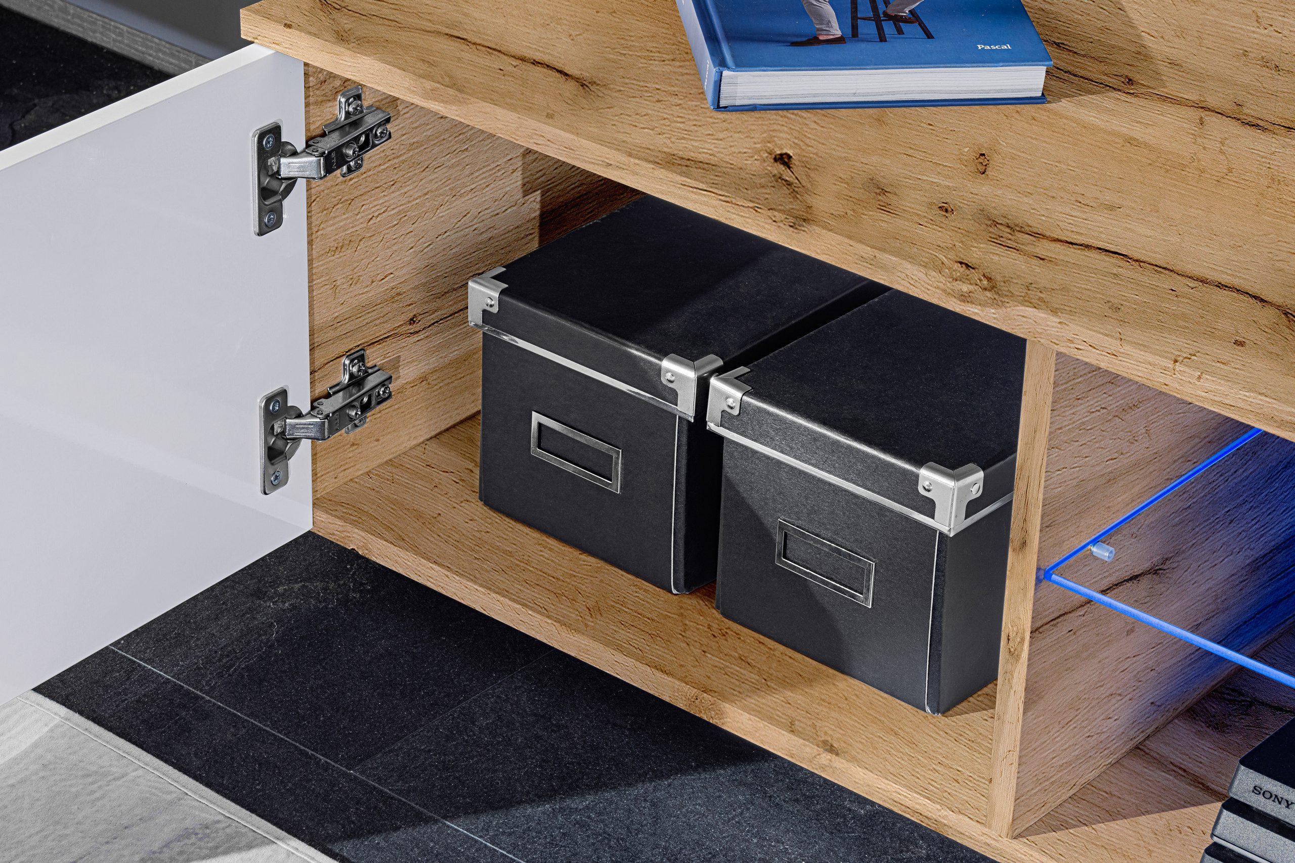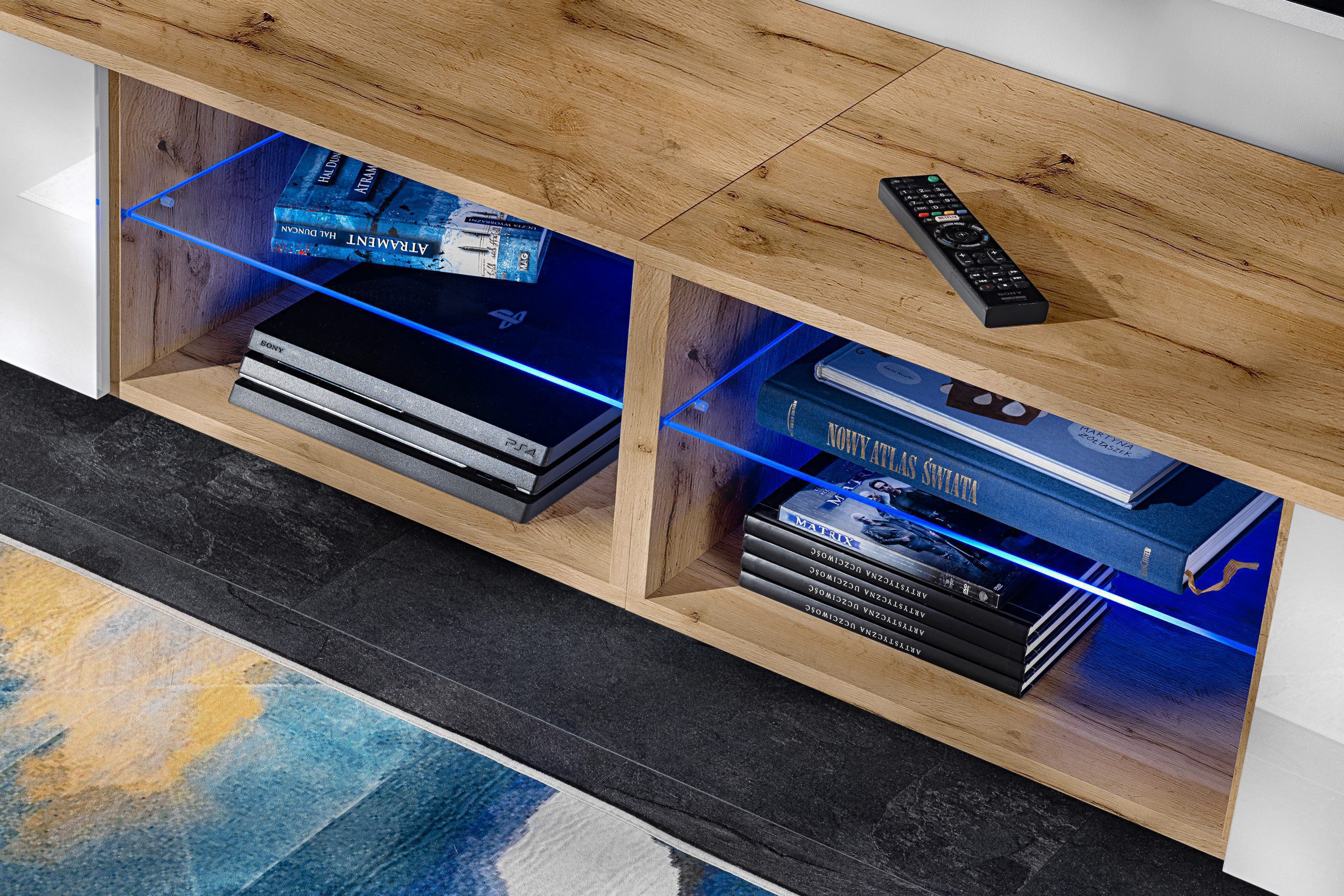 • 1 szafa RTV: szerokość 200 cm, wysokość 34,5 cm, głębokość 45 cm; opcjonalne oświetlenie LED