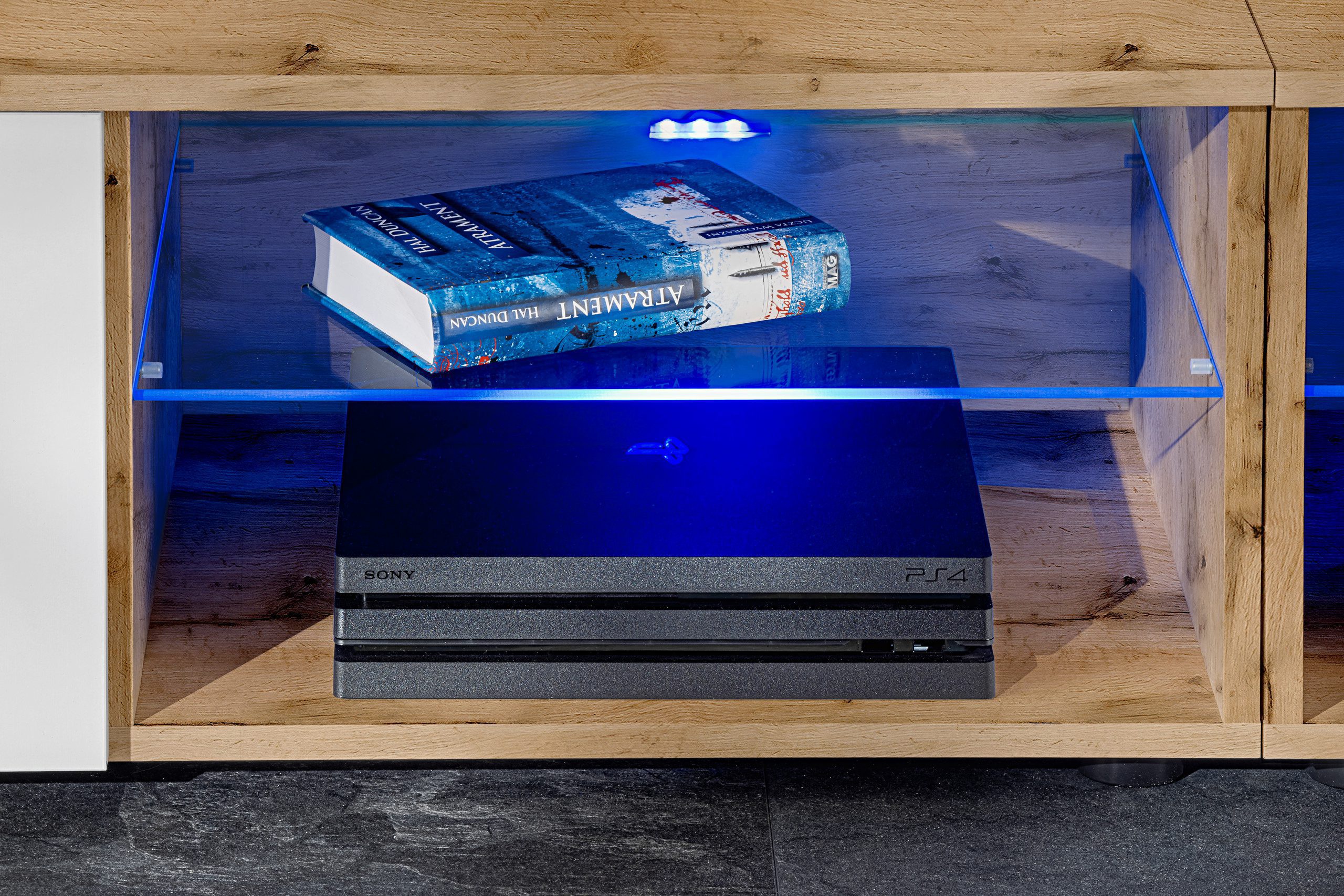 W wariancie z niebieskim lub RGB oświetleniem LED otrzymujesz podświetlenie szafki RTV oraz 2 witryn.