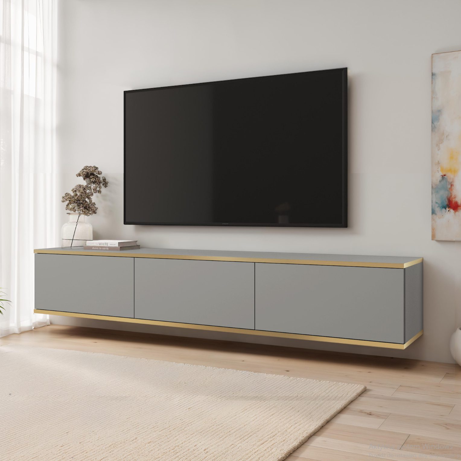 Szafka RTV Banff 175 to elegancki i lekki wizualnie mebel, który z powodzeniem odnajdzie się w nowoczesnych i klasycznych wnętrzach. Połączenie gładkiego, matowego frontu w kolorze szarym z korpusem w dekorze dąb artisan nadaje jej subtelny, a zarazem wyrafinowany wygląd. Trzy fronty otwierane systemem push-to-open ukrywają pojemne wnętrze, a wysokie, czarne metalowe nóżki dodają jej lekkości i ułatwiają sprzątanie pod meblem. Idealna jako podstawa pod telewizor, a także jako zamknięty mebel do przechowywania w salonie.