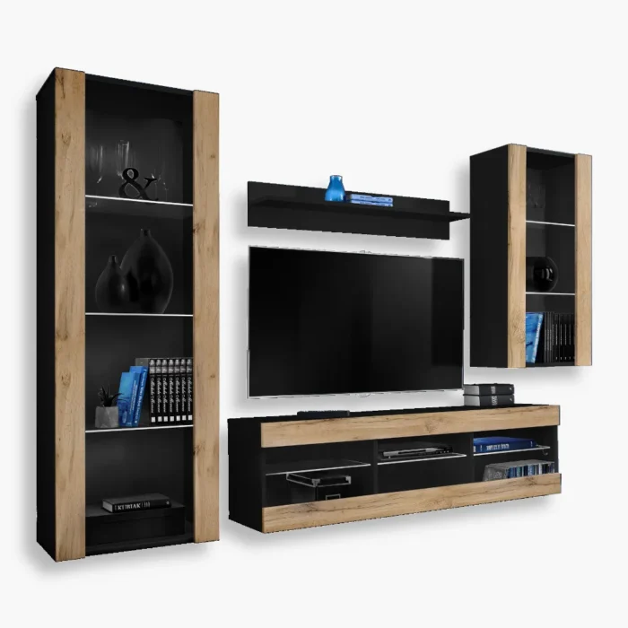 Set Meubles, Tivoli SET4, Noir/Wotan, Largeur 200cm x Hauteur 41cm x Profondeur 35cm, LED Bleu, pour Salon, Chambre à coucher