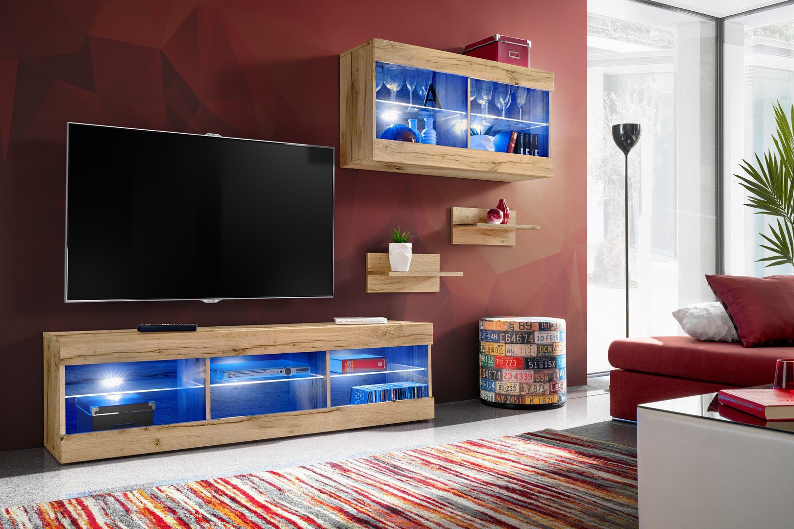 Komodee, Zestaw, Meblościanka, Tivoli SET3, Wotan/Wotan, Szerokość 240cm x Wysokość 159cm x Głębokość 35cm, LED Niebieskie, do Salonu, Sypialni