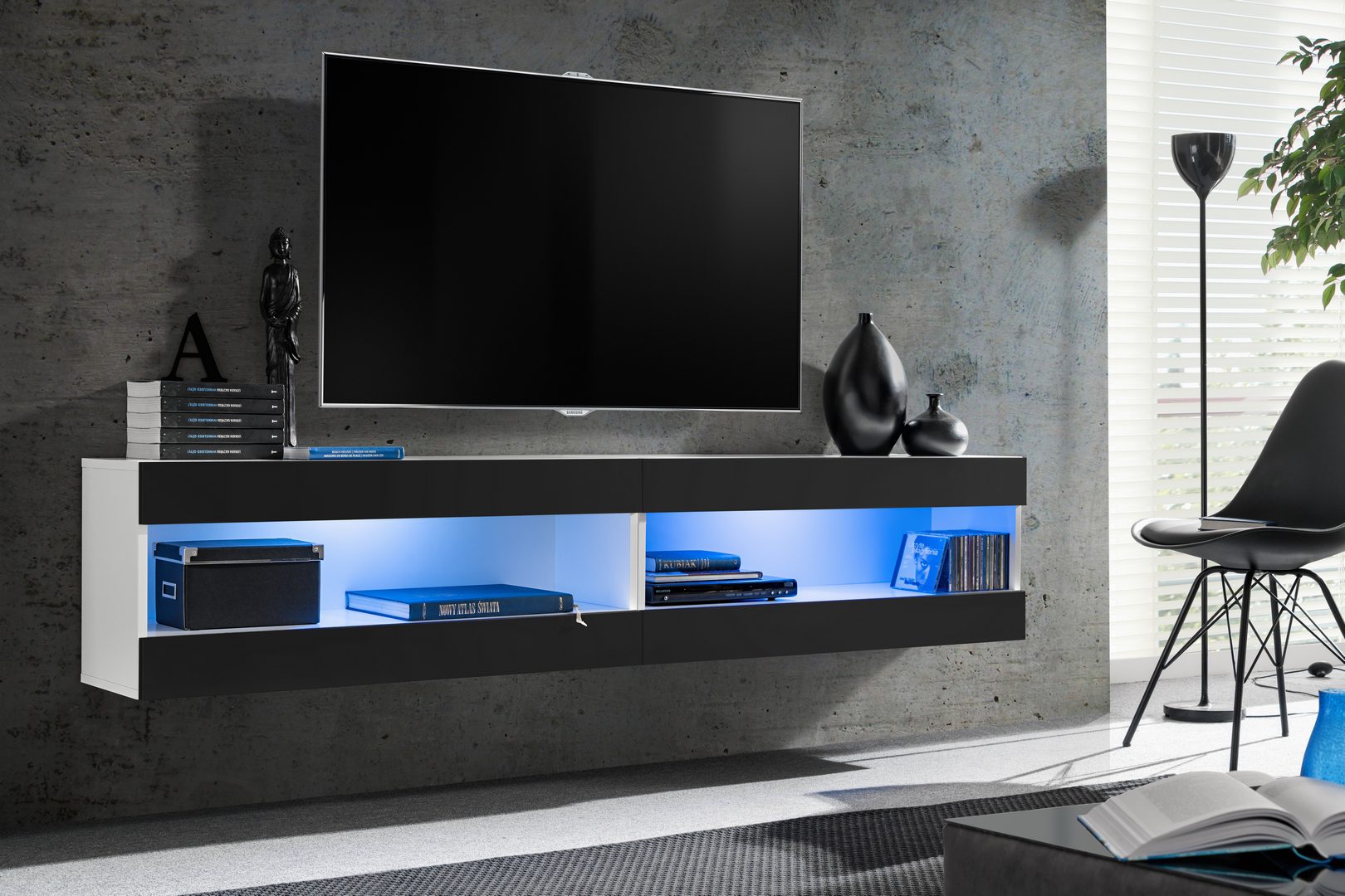 Komodee, Zestaw, Meblościanka, Tivoli SET4, Biały/Czarny, Szerokość 200cm x Wysokość 41cm x Głębokość 35cm, LED Niebieskie, do Salonu, Sypialni