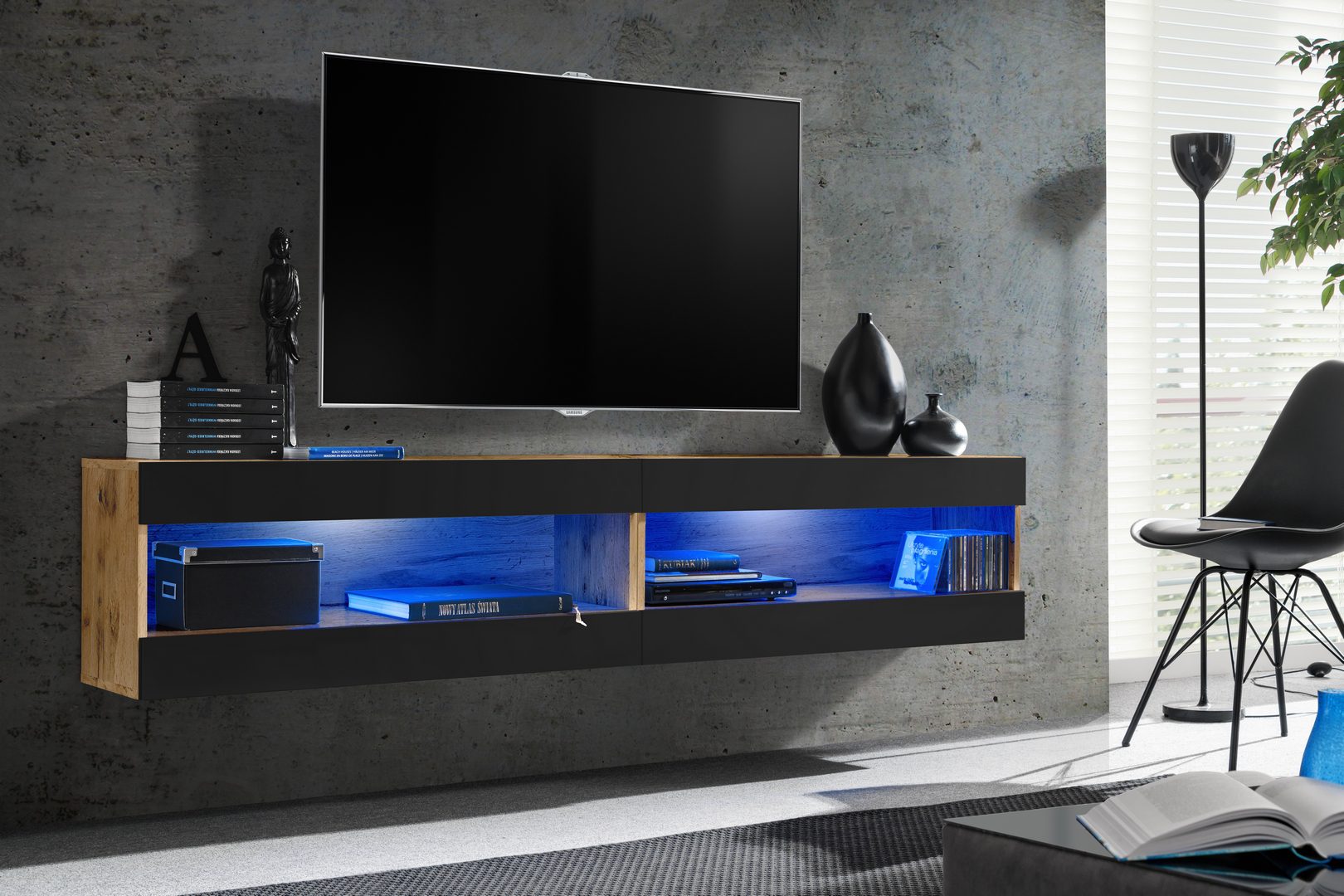 Komodee, Zestaw, Meblościanka, Tivoli SET4, Wotan/Czarny, Szerokość 200cm x Wysokość 41cm x Głębokość 35cm, LED Niebieskie, do Salonu, Sypialni