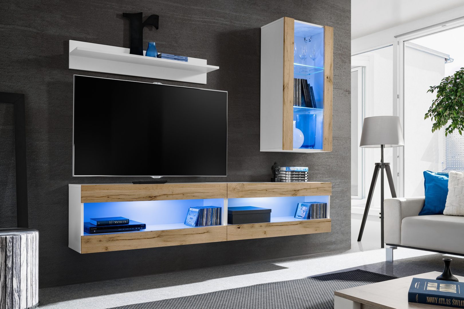 Set, Möbel, Tivoli SET5, Weiß/Wotan, Breite 200cm x Höhe 195cm x Tiefe 35cm, LED Blau, für Wohnzimmer, Schlafzimmer