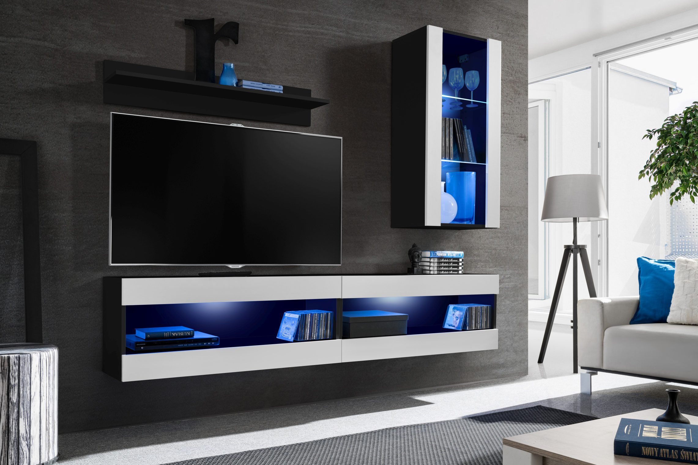Komodee, Zestaw, Meblościanka, Tivoli SET5, Czarny/Biały, Szerokość 200cm x Wysokość 195cm x Głębokość 35cm, LED Niebieskie, do Salonu, Sypialni