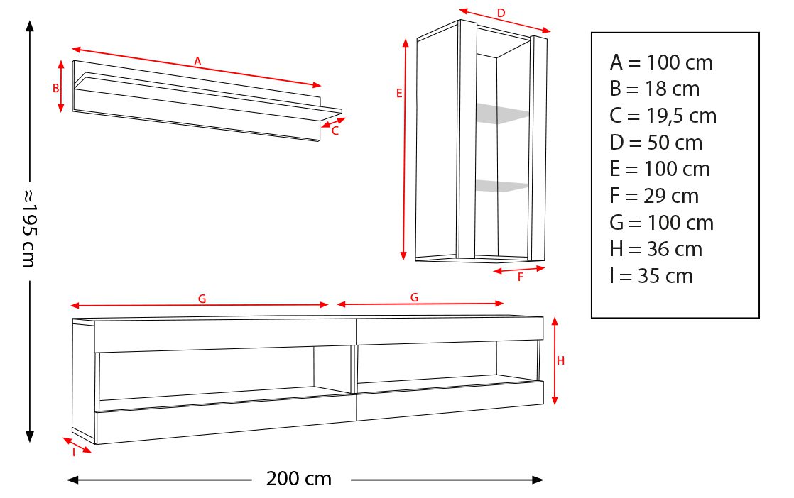Le set de meubles Tivoli SET5 offre de l’espace pour un téléviseur, des équipements audio, des disques vinyles, des livres, de la porcelaine, des souvenirs et des documents. Les meubles sont disponibles dans différents designs. La couleur du meuble et du devant peut être choisie séparément. Le set Tivoli peut facilement être ajusté à d’autres meubles, aux couleurs des murs et au style préféré. Les différents éléments du set peuvent être combinés librement. Grâce à cela, le set Tivoli s’adapte parfaitement aux maisons de différentes superficies. En combinaison avec un éclairage LED discret (en option), il crée une ambiance moderne et harmonieuse dans votre intérieur. Tivoli est un hommage au design italien élégant et intemporel. Set de meubles Tivoli : vitrine suspendue de largeur 50 cm x hauteur 100 cm x profondeur 35 cm avec 2 étagères en verre. 2x meuble TV suspendu de largeur 100 cm x hauteur 36 cm x profondeur 35 cm. Étagère suspendue de largeur 100 cm x hauteur 18 cm x profondeur 19,5 cm. Éclairage LED optionnel. Fabriqué en panneau stratifié (résistant à l’usure, aux rayures et à la décoloration). La vitrine permet un accès facile aux objets exposés. Le set contient des instructions de montage claires et tous les éléments nécessaires pour assembler le meuble. En raison des différents matériaux muraux (brique, plaque de plâtre, etc.), l’emballage ne contient pas de chevilles/hameçons. Les chevilles et crochets appropriés doivent être fournis par le client. ATTENTION : En raison de la diversité des murs auxquels les meubles sont fixés, des crochets de fixation doivent être achetés. Le choix de la méthode de montage dépend du type de mur que vous possédez, par exemple, bois, béton, plaque de plâtre, etc. Les meubles sont ouverts, sans vitrage. Saviez-vous que ? La Villa d’Este de la Renaissance, inscrite sur la Liste du Patrimoine Mondial de l’UNESCO, se trouve à Tivoli. Son charme intemporel a inspiré Franz Liszt à créer une série remarquable d’œuvres “Années de pèlerinage”.