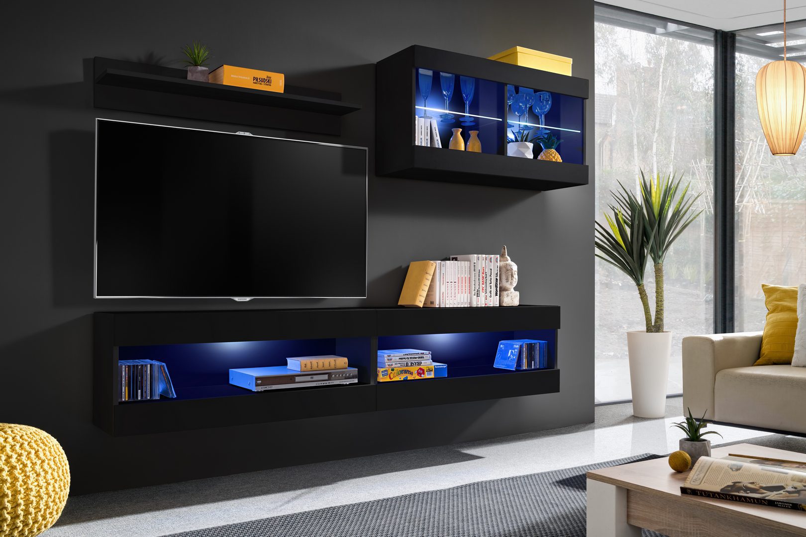 Tivoli Grande RTV Möbel Set, Weiß/Schwarz LED Beleuchtung Blau