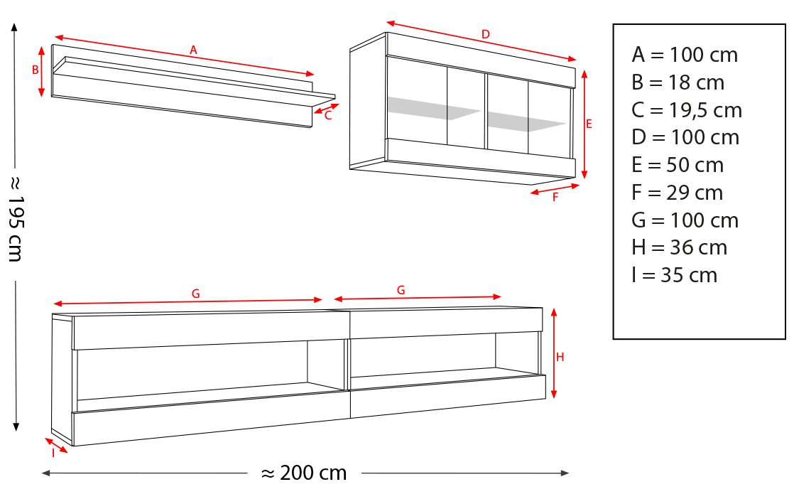 mit einer Breite von 100 cm x einer Höhe von 36 cm x einer Tiefe von 35 cm.